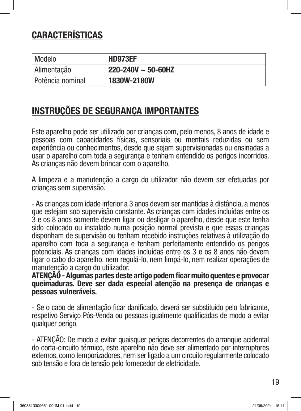 - As crianças com idade inferior a 3 anos devem ser mantidas à distência, a menos que estejam sob supervisão constante. As crianças com idades incluidas entre os 3 e os 8 anos somente devem ligar ou desligar o aparecido, desde que este tenha sido colocado ou instalado numa posicao normal prevista e que estas crianças disponham de supervisão ou tenham recebido instruções relatives à utilização do aparecido com toda a segurar e tenham perfeitamente sentido os perigos potecíveis. As crianças com idades incluidas entre os 3 e os 8 anos não devem ligar o cabo do aparecido, nem regula-lo, nem limpa-lo, nem realizar operações de manutenção a cargo do Utilizador.