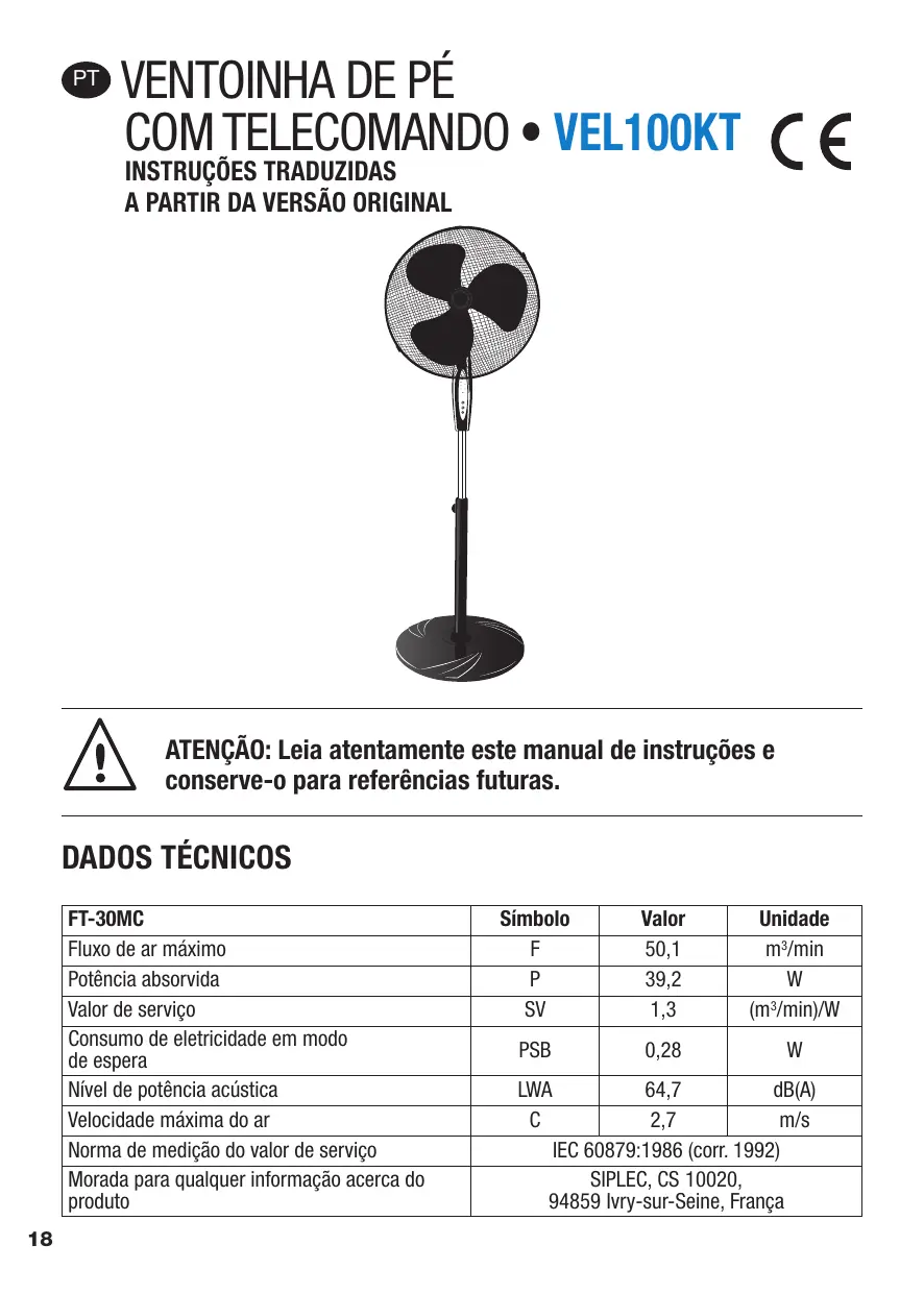 E. Leclerc), el producto será sustituido y la garantía total se renovará. 6. La garantía* no incluye cualquier daño, avería, fallo o defecto asociado: a. a un uso o una instalación que no cumpla las recomendaciones indicadas en el manual de instrucciones facilitado. b. a los daños provocados por una causa ajena al producto. c. a una modificación de las características técnicas por parte del usuario. d. a un uso de carácter profesional. *Tras un análisis realizado por los puntos de servicio posventa E. LECLERC o por el punto de venta E. LECLERC. 7. La garantía solo será aplicable en los puntos de venta E. LECLERC. En caso de que el producto sufra cualquier problema o fallo, deberá acudir siempre a un punto de venta E. LECLERC. para poder disfrutar de la cobertura de la garantía. 8. Cualquier solicitud al servicio posventa solo podrá atenderse si: a. Se facilita una prueba de compra (ticket de caja o tarjeta E. LECLERC). b. El producto es estrictamente idéntico al comprado. 9. Su tienda E. LECLERC está a su disposición para ofrecerle cualquier información complementaria. 10. También tiene a su disposición el número verde 0800 35 35 20 (llamada sin tarificación adicional). *En el caso de accesorios del producto vendidos por separado. Nível de potência acústica Velocidade máxima do ar Norma de medição do valor de serviço Morada para qualquer informação acerca do produto 18