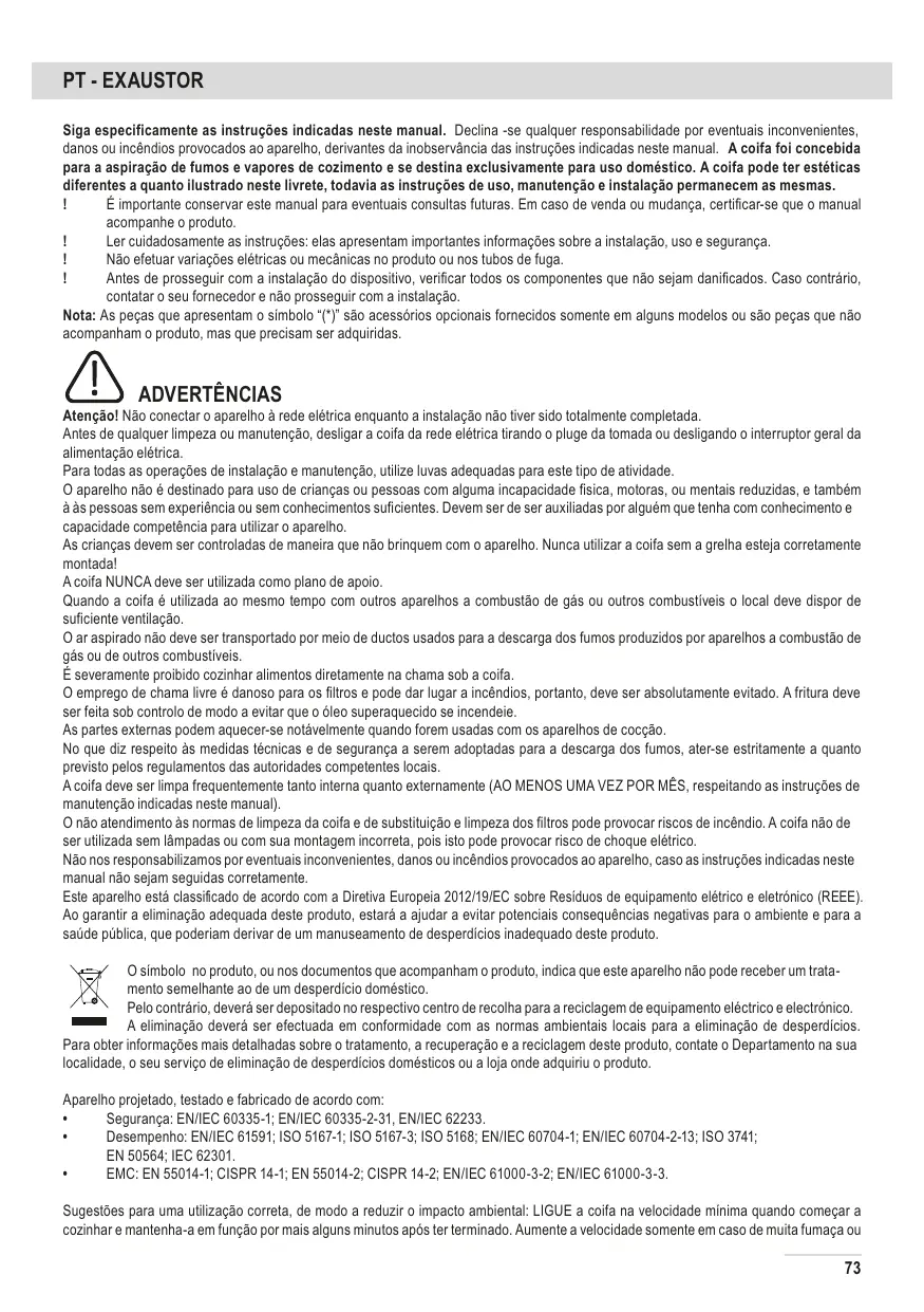 Siga especificamente as instruções indicadas neste manual. Declina -se qualquer responsabilidade por eventuais inconvenientes, danos ou incêndios provocados ao aparelho, derivantes da inobservância das instruções indicadas neste manual. A coifa foi concebida para a aspiração de fumos e vapores de cozimento e se destina exclusivamente para uso doméstico. A coifa pode ter estéticas diferentes a quanto ilustrado neste livrete, todavia as instruções de uso, manutenção e instalação permanecem as mesmas. É importante conservar este manual para eventuais consultas futuras. Em caso de venda ou mudança, certificar-se que o manual acompanhe o produto. Ler cuidadosamente as instruções: elas apresentam importantes informações sobre a instalação, uso e segurança. Não efetuar variações elétricas ou mecânicas no produto ou nos tubos de fuga. Antes de prosseguir com a instalação do dispositivo, verificar todos os componentes que não sejam danificados. Caso contrário, contatar o seu fornecedor e não prosseguir com a instalação. Nota: As peças que apresentam o símbolo “(*)” são acessórios opcionais fornecidos somente em alguns modelos ou são peças que não acompanham o produto, mas que precisam ser adquiridas. ADVERTÊNCIAS Atenção! Não conectar o aparelho à rede elétrica enquanto a instalação não tiver sido totalmente completada. Antes de qualquer limpeza ou manutenção, desligar a coifa da rede elétrica tirando o pluge da tomada ou desligando o interruptor geral da alimentação elétrica. Para todas as operações de instalação e manutenção, utilize luvas adequadas para este tipo de atividade. O aparelho não é destinado para uso de crianças ou pessoas com alguma incapacidade fisica, motoras, ou mentais reduzidas, e também à às pessoas sem experiência ou sem conhecimentos suficientes. Devem ser de ser auxiliadas por alguém que tenha com conhecimento e capacidade competência para utilizar o aparelho. As crianças devem ser controladas de maneira que não brinquem com o aparelho. Nunca utilizar a coifa sem a grelha esteja corretamente montada! A coifa NUNCA deve ser utilizada como plano de apoio. Quando a coifa é utilizada ao mesmo tempo com outros aparelhos a combustão de gás ou outros combustíveis o local deve dispor de suficiente ventilação. O ar aspirado não deve ser transportado por meio de ductos usados para a descarga dos fumos produzidos por aparelhos a combustão de gás ou de outros combustíveis. É severamente proibido cozinhar alimentos diretamente na chama sob a coifa. O emprego de chama livre é danoso para os filtros e pode dar lugar a incêndios, portanto, deve ser absolutamente evitado. A fritura deve ser feita sob controlo de modo a evitar que o óleo superaquecido se incendeie. As partes externas podem aquecer-se notávelmente quando forem usadas com os aparelhos de cocção. No que diz respeito às medidas técnicas e de segurança a serem adoptadas para a descarga dos fumos, ater-se estritamente a quanto previsto pelos regulamentos das autoridades competentes locais. A coifa deve ser limpa frequentemente tanto interna quanto externamente (AO MENOS UMA VEZ POR MÊS, respeitando as instruções de manutenção indicadas neste manual). O não atendimento às normas de limpeza da coifa e de substituição e limpeza dos filtros pode provocar riscos de incêndio. A coifa não de ser utilizada sem lâmpadas ou com sua montagem incorreta, pois isto pode provocar risco de choque elétrico. Não nos responsabilizamos por eventuais inconvenientes, danos ou incêndios provocados ao aparelho, caso as instruções indicadas neste manual não sejam seguidas corretamente. Este aparelho está classificado de acordo com a Diretiva Europeia 2012/19/EC sobre Resíduos de equipamento elétrico e eletrónico (REEE). Ao garantir a eliminação adequada deste produto, estará a ajudar a evitar potenciais consequências negativas para o ambiente e para a saúde pública, que poderiam derivar de um manuseamento de desperdícios inadequado deste produto. O símbolo no produto, ou nos documentos que acompanham o produto, indica que este aparelho não pode receber um tratamento semelhante ao de um desperdício doméstico. Pelo contrário, deverá ser depositado no respectivo centro de recolha para a reciclagem de equipamento eléctrico e electrónico. A eliminação deverá ser efectuada em conformidade com as normas ambientais locais para a eliminação de desperdícios. Para obter informações mais detalhadas sobre o tratamento, a recuperação e a reciclagem deste produto, contate o Departamento na sua localidade, o seu serviço de eliminação de desperdícios domésticos ou a loja onde adquiriu o produto. Aparelho projetado, testado e fabricado de acordo com: Segurança: EN/IEC 60335-1; EN/IEC 60335-2-31, EN/IEC 62233. Desempenho: EN/IEC 61591; ISO 5167-1; ISO 5167-3; ISO 5168; EN/IEC 60704-1; EN/IEC 60704-2-13; ISO 3741; EN 50564; IEC 62301. EMC: EN 55014-1; CISPR 14-1; EN 55014-2; CISPR 14-2; EN/IEC 61000-3-2; EN/IEC 61000-3-3. Sugestões para uma utilização correta, de modo a reduzir o impacto ambiental: LIGUE a coifa na velocidade mínima quando começar a cozinhar e mantenha-a em função por mais alguns minutos após ter terminado. Aumente a velocidade somente em caso de muita fumaça ou