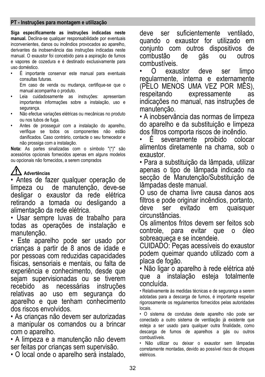 Aténgase estrictamente a las instrucciones del presente manual. Se declina cada responsabilidad por eventuales inconvenientes, daños o incendios provocados al aparato originados por la inobservancia de las instrucciones colocadas en este manual. La campana extractora ha sido ideada para la aspiración de humos y vapores producidos durante la cocción y para el uso doméstico.