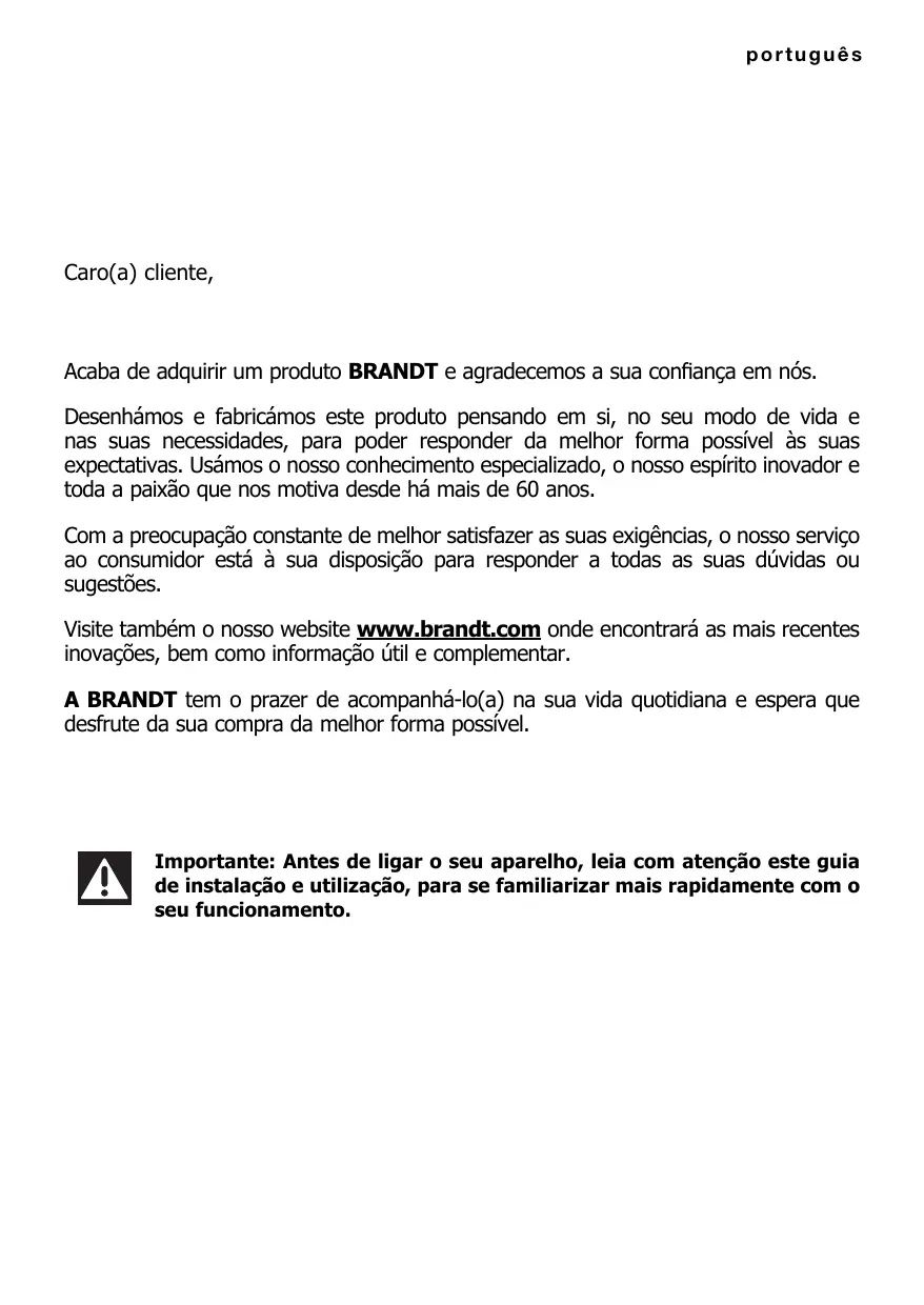 português Caro(a) cliente, Acaba de adquirir um produto BRANDT e agradecemos a sua confiança em n6s. Desenhämos e fabricämos este produto pensando em si, no seu modo de vida e nas suas necessidades, para poder responder da melhor forma possivel às suas expectativas. Usämos o nosso conhecimento especializado, o nosso espirito inovador e toda a paixäo que nos motiva desde hâ mais de 60 anos. Com a preocupaçäo constante de melhor satisfazer as suas exigências, o nosso serviço ao consumidor estä à sua disposiçäo para responder a todas as suas düvidas ou sugestèes. Visite também o nosso website www.brandt.com onde encontraré as mais recentes inovaçôes, bem como informaçäo ütil e complementar. A BRANDT tem o prazer de acompanhä-lo(a) na sua vida quotidiana e espera que desfrute da sua compra da melhor forma possivel. de instalaçäo e utilizaçäo, para se familiarizar mais rapidamente com o A| importante: Antes de ligar o seu aparelho, leia com atençäo este guia seu funcionamento.