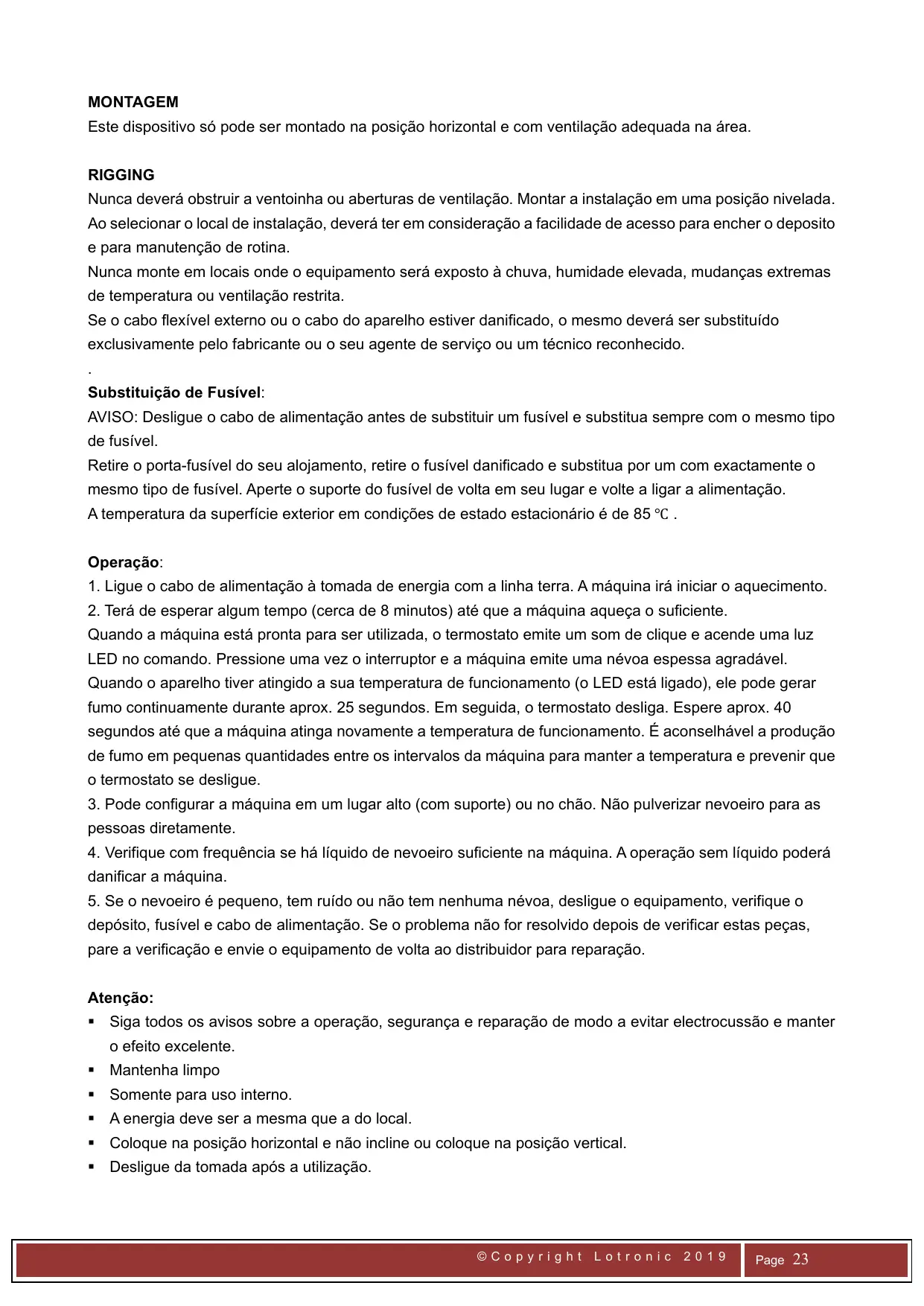 “ Todas as méquinas de nevoeiro säo propensas ao entupimento devido à consistência do fluido e às altas temperaturas em que se vaporiza. No entanto, uma mäquina bem conservada deve proporcionar muitos anos de utilizaçäo.