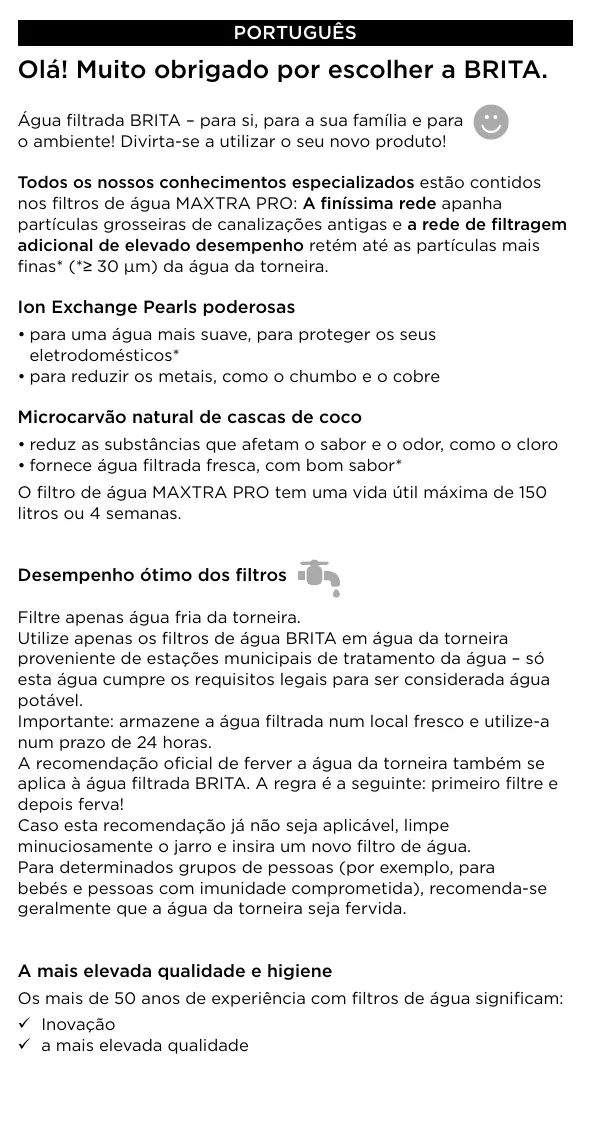 Olä! Muito obrigado por escolher a BRITA. ÂÀgua filtrada BRITA - para si, para à sua familia e para © ambiente! Divirta-se a utilizar o seu novo produto! Todos os nossos conhecimentos especializados estäo contidos nos filtros de égua MAXTRA PRO: A finissima rede apanha particulas grosseiras de canalizaçôes antigas e a rede de filtragem adicional de elevado desempenho retém até as particulas mais finas* (2 30 um) da âgua da torneira lon Exchange Pearls poderosas + para uma âgua mais suave, para proteger os seus eletrodomésticos* + para reduzir os metais, como o chumbo e o cobre Microcarväo natural de cascas de coco + reduz as substâncias que afetam o sabor e o odor, como o cloro + fornece ägua filtrada fresca, com bom sabor* O filtro de égua MAXTRA PRO tem uma vida ütil mäxima de 150 litros où 4 semanas. Desempenho étimo dos filtros Filtre apenas égua fria da torneira. Utilize apenas os filtros de âgua BRITA em gua da torneira proveniente de estaçôes municipais de tratamento da âgua - sé esta âgua cumpre os requisitos legais para ser considerada âgua potävel. importante: armazene à égua filtrada num local fresco e utilize-a num prazo de 24 horas. A recomendaçäo oficial de ferver à âgua da torneira também se aplica à égua filtrada BRITA. A regra é a seguinte: primeiro filtre e depois ferval Caso esta recomendaçäo jé nâo seja aplicävel, limpe minuciosamente o jarro e insira um novo filtro de âgua. Para determinados grupos de pessoas (por exemplo, para bebés e pessoas com imunidade comprometida), recomenda-se geralmente que a égua da torneira seja fervida A mais elevada qualidade e higiene Os mais de 50 anos de experiéncia com filtros de égua significam: *_Inovaçäo Ya mais elevada qualidade