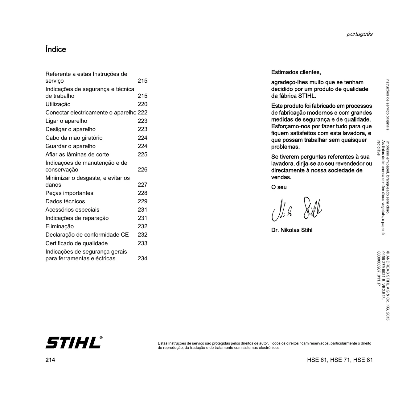 00081025 LÀ Todos os produtos da STIHL correspondem às mäâximas exigências de qualidade. Pela certificaçäo por uma sociedade independente é confirmado ao fabricante STIHL que todos os produtos referentes ao desenvolvimento dos produtos, ao aprovisionamento de materiais, à fabricaçäo, à montagem, à documentaçäo e ao serviço de assistncia técnica, satisfazem as exigências severas da norma internacional ISO 9001 para os sistemas de administraçäo de qualidade. português