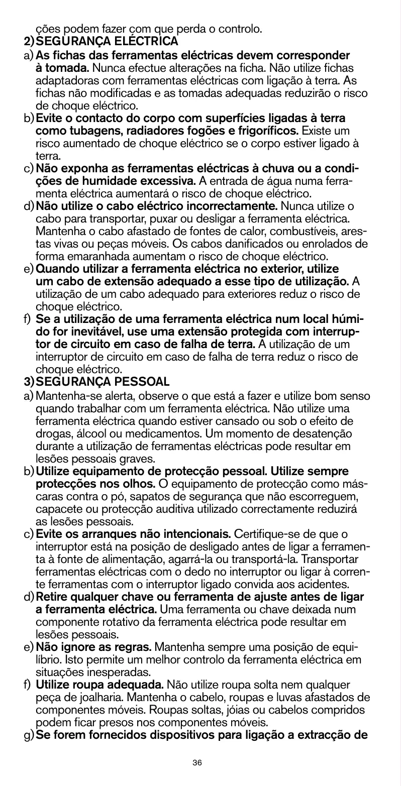 c) Évitez tout démarrage intempestif. Vérfiez que l'interrupteur est sur arrêt avant le branchement sur le secteur et/ou l'insertion de la batterie, la prise de l'appareil ou son transport. Le transport d'outils électroportatifs avec votre doigt sur le commutateur ou leur mise sous tension avec le commutateur sur marche est source d'accidents.