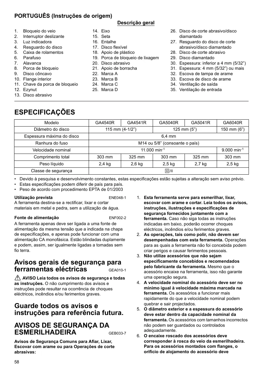 Designaciôn de la mäquina: Esmeriladora Angular N° de modelo/ Tipo: GA4540R, GA4541R, GA5040R, GA5041R, GA6040R Cumplen con las siguientes Directivas europeas: 2006/42/CE Se han fabricado de acuerdo con los siguientes eständares o documentos estandarizados: