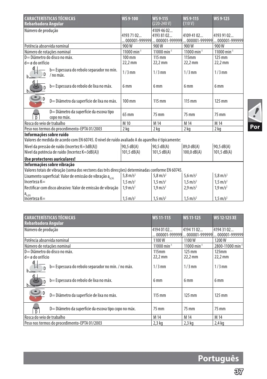 Encontre gratuitamente o manual do aparelho WS 9-100, WS 9-115, WS 9-125, WS 11-115, WS 11-125, WS 12-125 XE AEG em formato PDF.