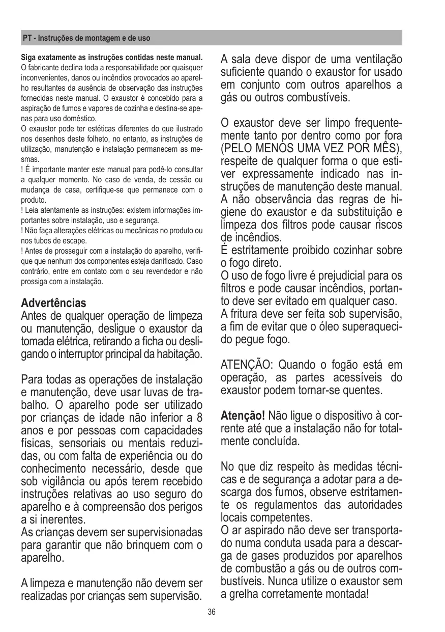 Siga exatamente as instruçôes contidas neste manual. O fabricante declina toda a responsabiidade por quaisquer inconvenientes, danos ou incéndios provocados ao aparel- ho resultantes da auséncia de observaçäo das instruçôes fornecidas neste manual. O exaustor é concebido para a aspiraçéo de fumos e vapores de cozinha e destina-se ape- nas para uso doméstico.