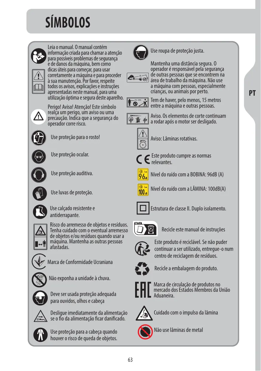 SIMBOLOS Leia o manual. O manual contém informaçäo criada para chamar a atençäo para possiveis problemas de segurança e de danos da mäquina, bem como dicas Üteis para comecar, para usar corretamente a méquina € para proceder à sua manutençäo. Por favor, respeite todos os avisos, explicaçües e instruçües apresentadas neste manual, para uma utilizaçäo éptima e segura deste aparelho. Perigo! Aviso! Atençäo! Este simbolo © Use roupa de proteçäo justa. Mantenha uma distäncia segura. operador é responsävel pela segurança le outras pessoas que se encontrem na rea de trabalho da mäquina. Näo use à méquina com pessoas, especialmente crianças, ou animais por perto. fem de haver, pelo menos, 15 metros ntre a mâquina e outras pessoas. realça um perigo, um aviso ou uma VAN precauçäo. Indica que à segurança do operador core risco. Aviso. Os elementos de corte continuam a rodar apôs o motor ser desligado. Use proteçäo para o rosto! Use proteçäo ocular. Use proteçäo auditiva. Use luvas de proteçäo. Use calçado resistente e antiderrapante. Risco do arremesso de objetos e residuos. Tenha cuidado com o eventual arremesso de objetos e/ou residuos quando usar a mäquina. Mantenha as outras pessoas afastadas. K) Näo exponha a unidade à chuva. Deve ser usada proteçäo adequada para ouvidos, olhos e cabeça pen imediatamente da alimentaçäo PaN se o fo da alimentaçäo ficar danificado. Use proteçäo para à cabeça quando houver o risco de queda de objetos.