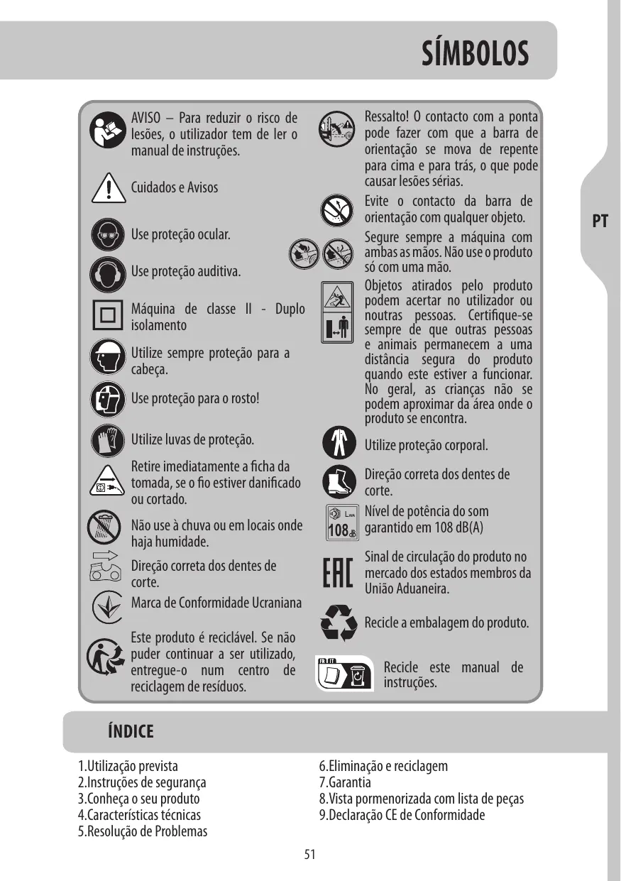(EI Direçäo correta dos dentes de corte. f@ | Nivel de poténcia do som fo garantido em 108 dB(A) Sinal de drculaçäo do produto no mercado dos estados membros da Uniäo Aduaneira. Ac) Recicle a embalagem do produto. Recicle este manual de instruçôes.