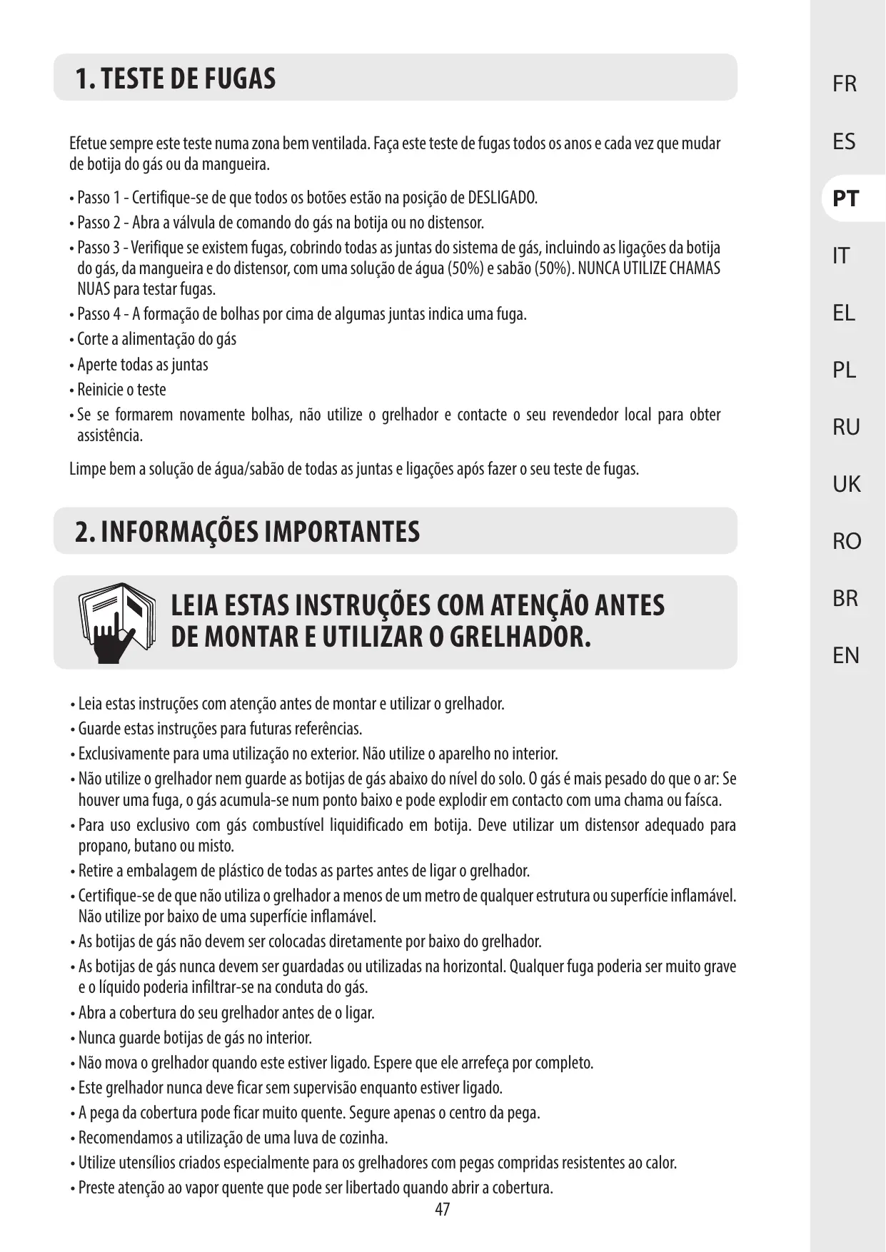 + Avant d'utiliser votre barbecue faîtes un test de fuite. C'est le seul moyen fiable de détecter une fuite de gaz sur les joints ou les connexions après le montage.