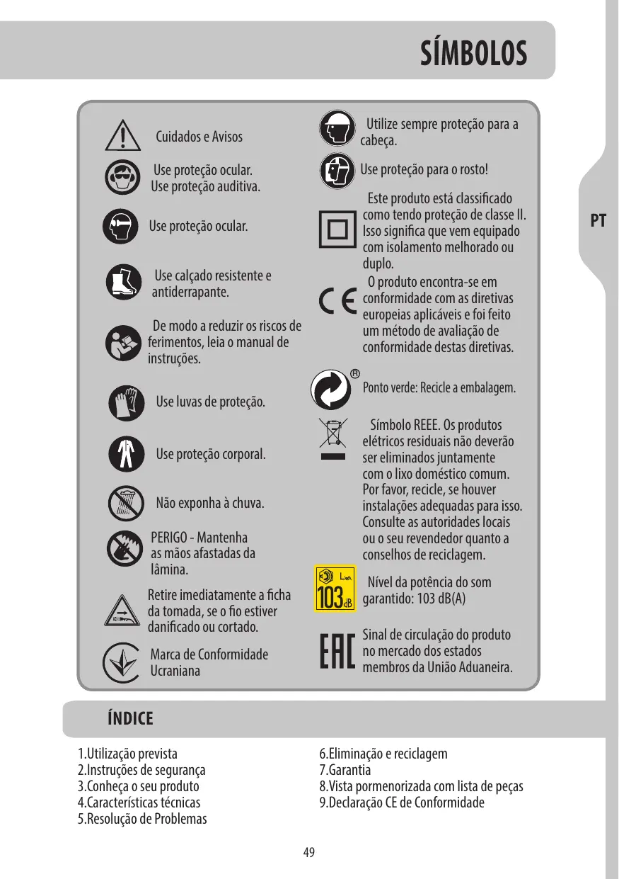 1.Utilizaçäo prevista 2.Instruçôes de segurança 3.Conheça o seu produto 4.Caracteristicas técnicas 5.Resoluçäo de Problemas