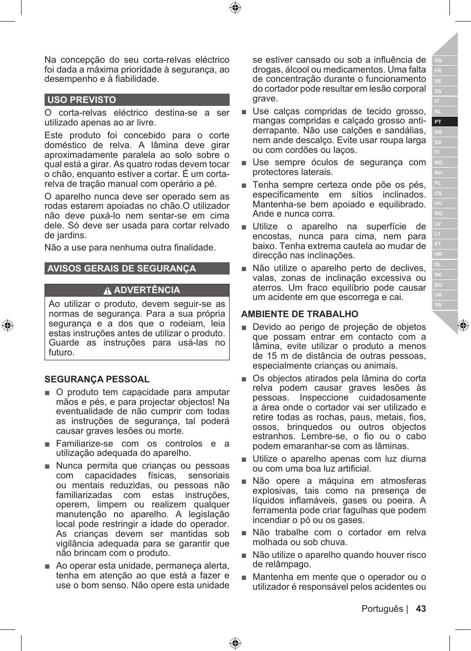 = La tondeuse à gazon est capable d'amputer les mains et les pieds, ainsi que de projeter des objets. Le non-respect de toutes les règles de sécurité est susceptible d'entraîner des blessures graves voire mortelles.