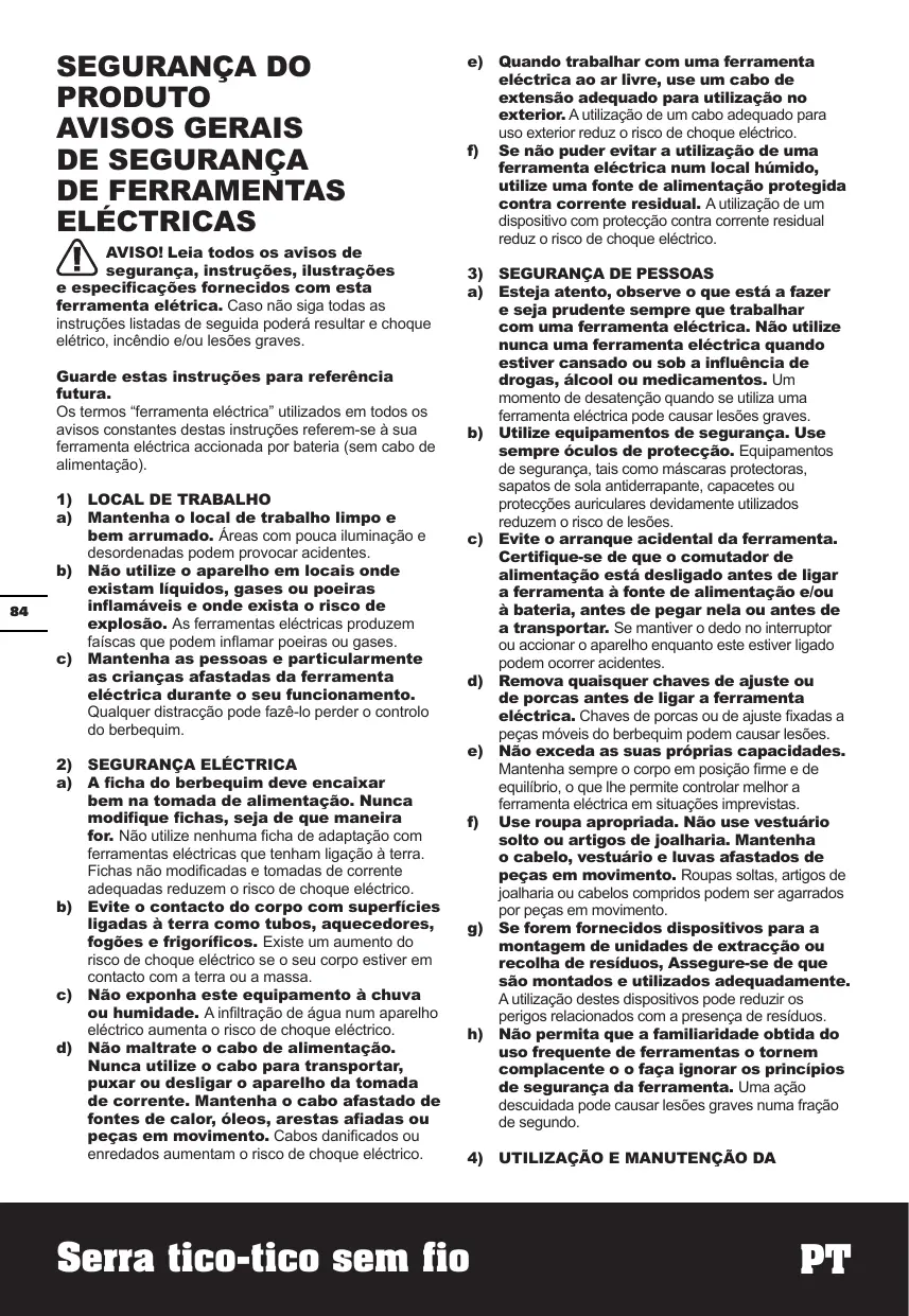 AVERTISSEMENTS DE SÉCURITÉ POUR SCIE SABRE Tenir l'outil par les zones de prises isolées lors d'une utilisation où l'outil tranchant pourrait entrer en contact avec des fils cachés. l'accessoire de coupe, s'il entre en contact avec un fil “sous tension’ peut mettre les parties métalliques exposées de l'outil “sous tension” et électrocuter l'opérateur.