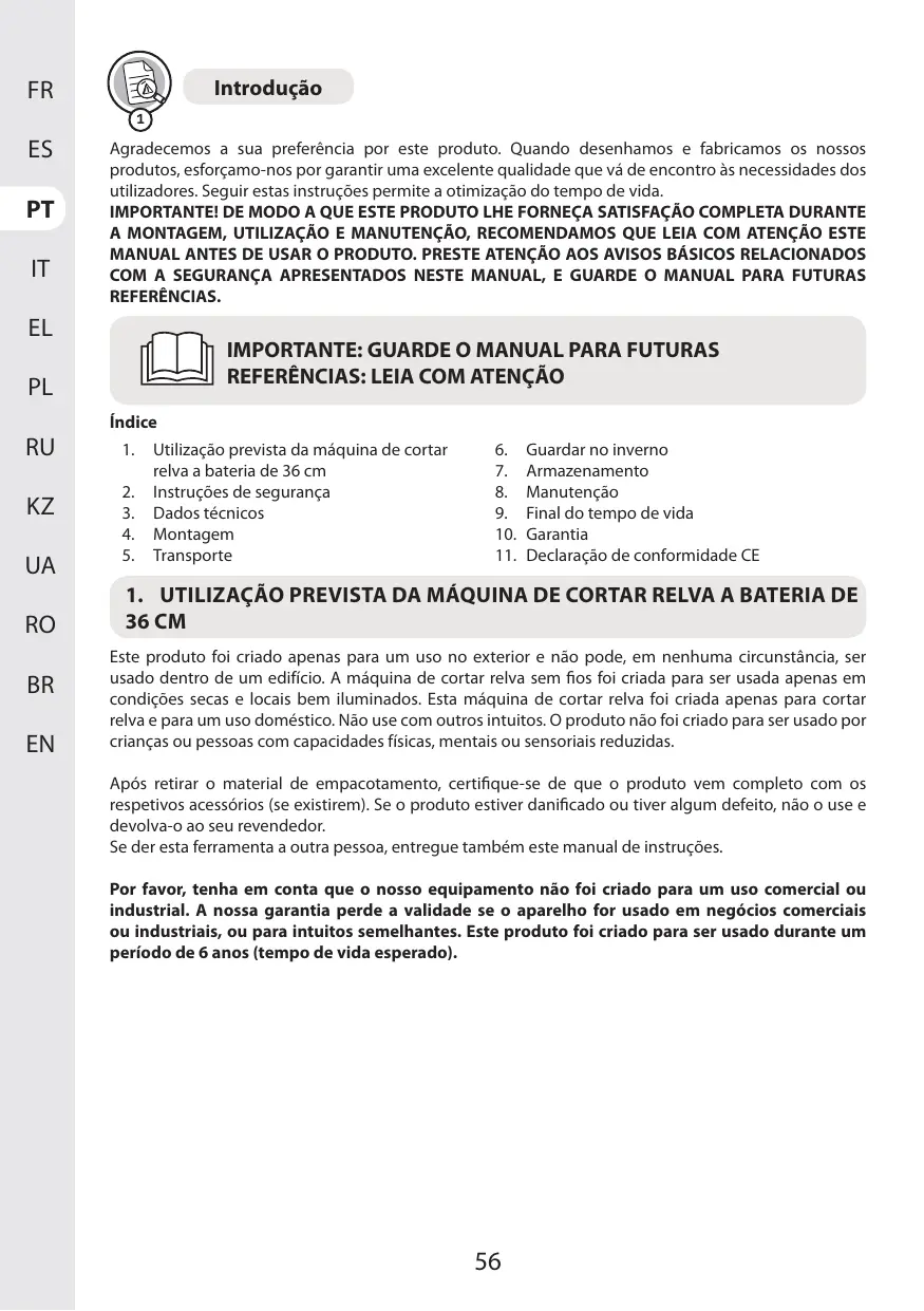 IMPORTANTE: GUARDE O MANUAL PARA FUTURAS REFERÊNCIAS: LEIA COM ATENÇÂO Indice 1. Utilizaçäo prevista da méquina de cortar 6. Guardarnoinvemo relva a bateria de 36 cm 7... Armazenamento 2." Instruçôes de segurança 8. Manutençäo 3. Dados técnicos 9... Final do tempo de vida 4. Montagem 10. Garantia 5. Transporte 11. Declaraçäo de conformidade CE