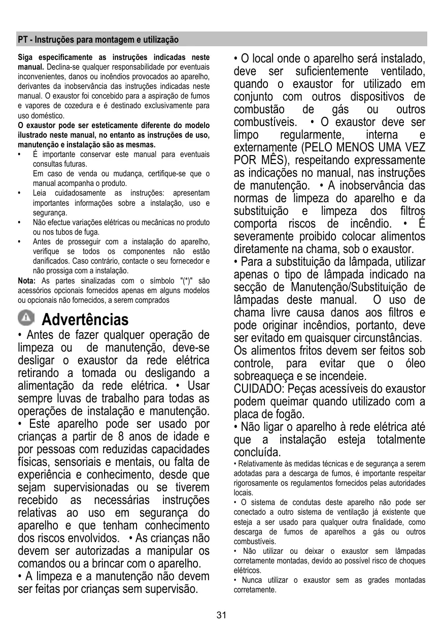 + Ne pas utiliser ou laisser la hotte sans les lampes correctement montées, car un éventuel risque de choc électrique est possible.