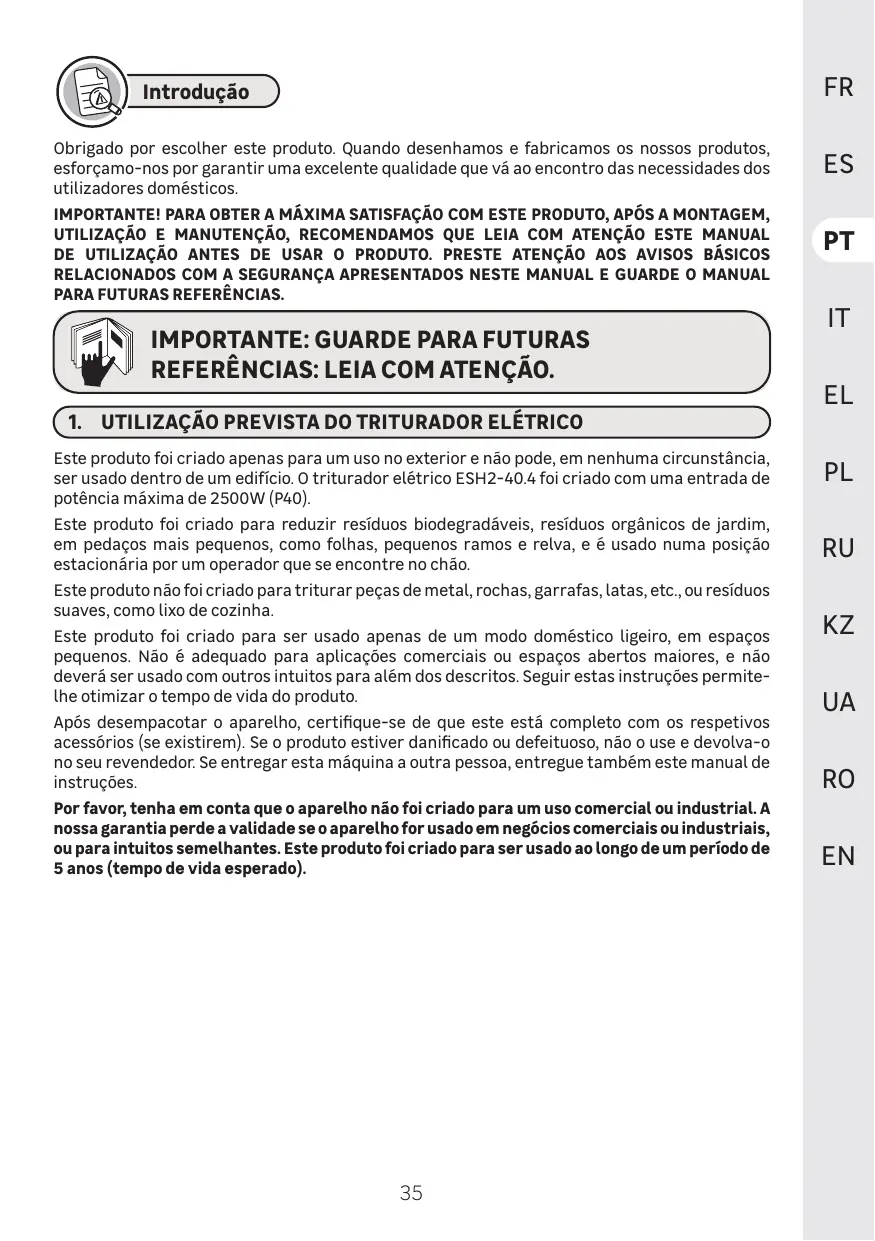 Este produto foi criado apenas para um uso no exterior e nâo pode, em nenhuma circunstäncia, ser usado dentro de um edificio. O triturador elétrico ESH2-40.4 foi criado com uma entrada de poténcia mâxima de 2500W (P40).