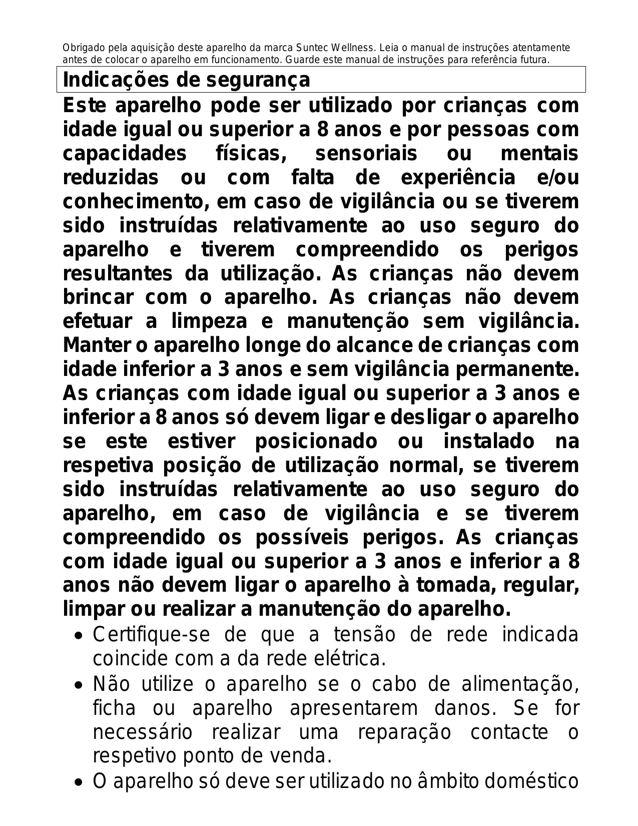 BEDIENUNGSANLEITUNG Obrigado pela aquisiçäo deste aparelho da marca Suntec Wellness. Leia o manual de instruçôes atentamente antes de colocar o aparelho em funcionamento. Guarde este manual de instruçôes para referência futura.