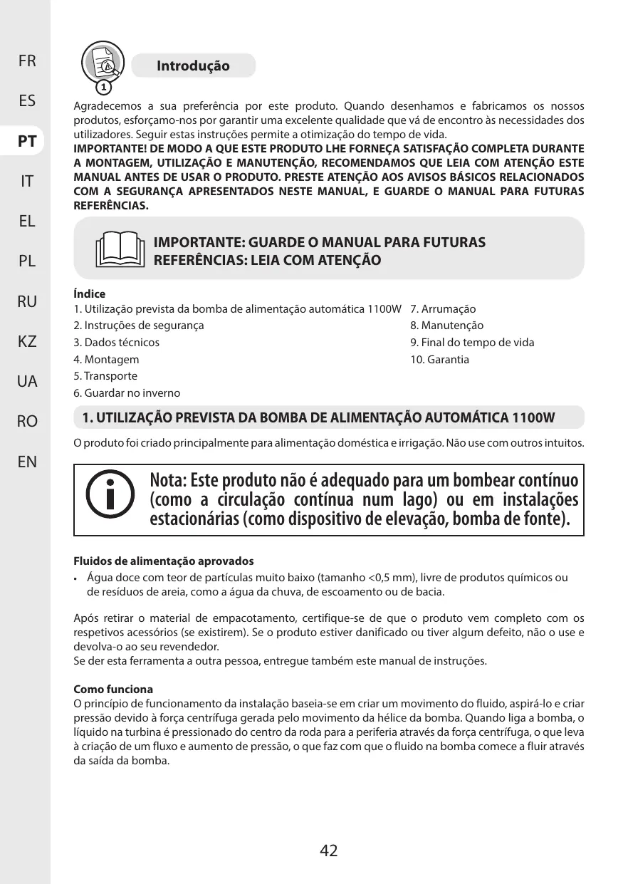 1. Utilisation prévue de la pompe d'alimentation automatique 1100W 7. Rangement (le cas échéant). Si le produit est endommagé ou présente un défaut, ne l'utilisez pas et retournez-le à votre revendeur.