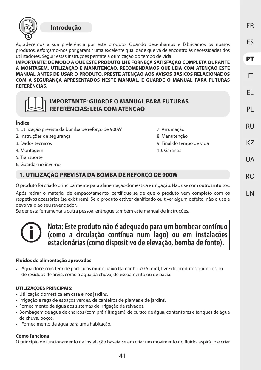 Remarque : Ce produit n'est pas adapté à un fonctionnement de la pompe en continu (par exemple circulation continue dans un bassin) ni à des installations fixes (par exemple dispositif de levage, pompe pour fontaine).