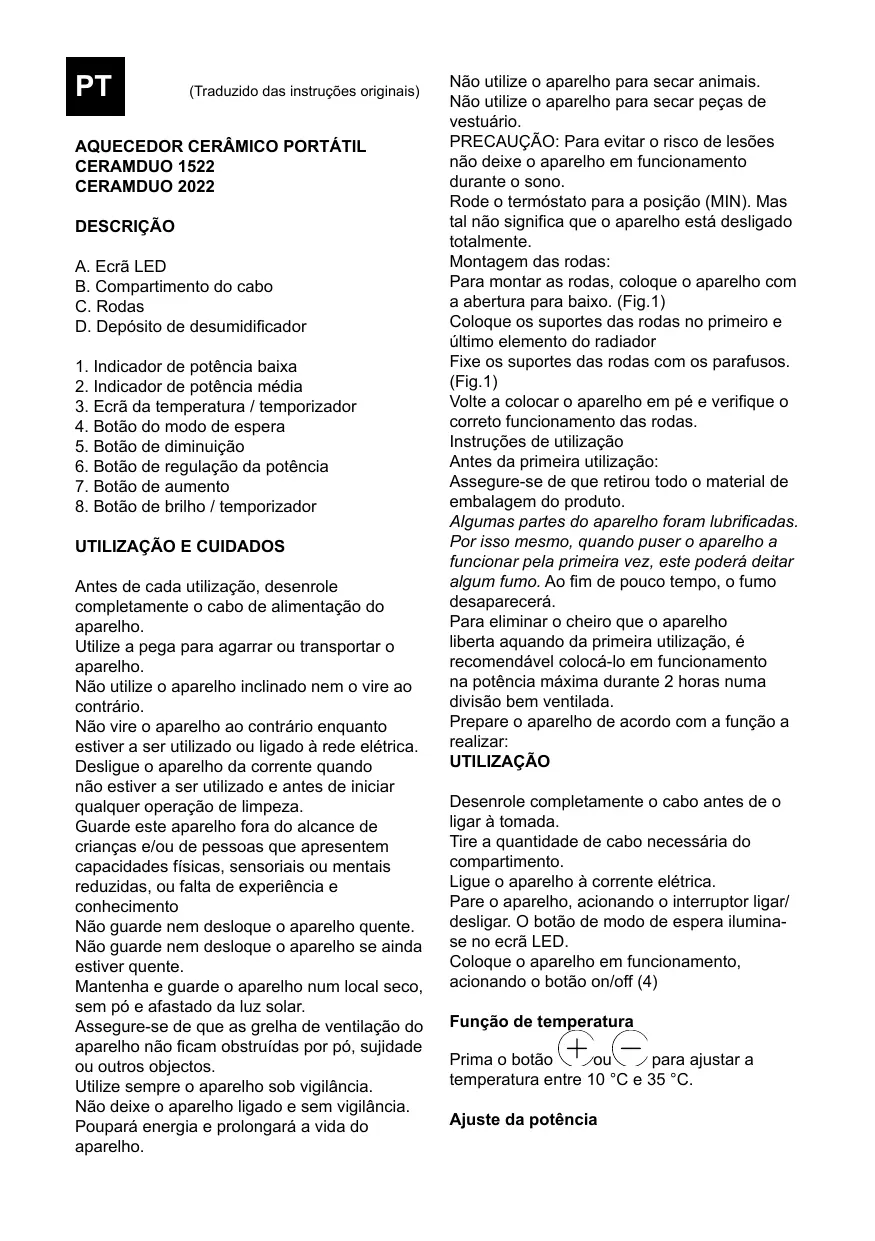 ADVERTÉNCIA: Antes de encher o depôsito, desligue o aquecedor e desligue-o da tomada. Evite possiveis salpicos no aparelho. ADVERTÉNCIA: Utilize somente ägua desmineralizada para encher o depésito: Näo utilize perfumes, essências, éleos ou outros liquidos inflamäveis.