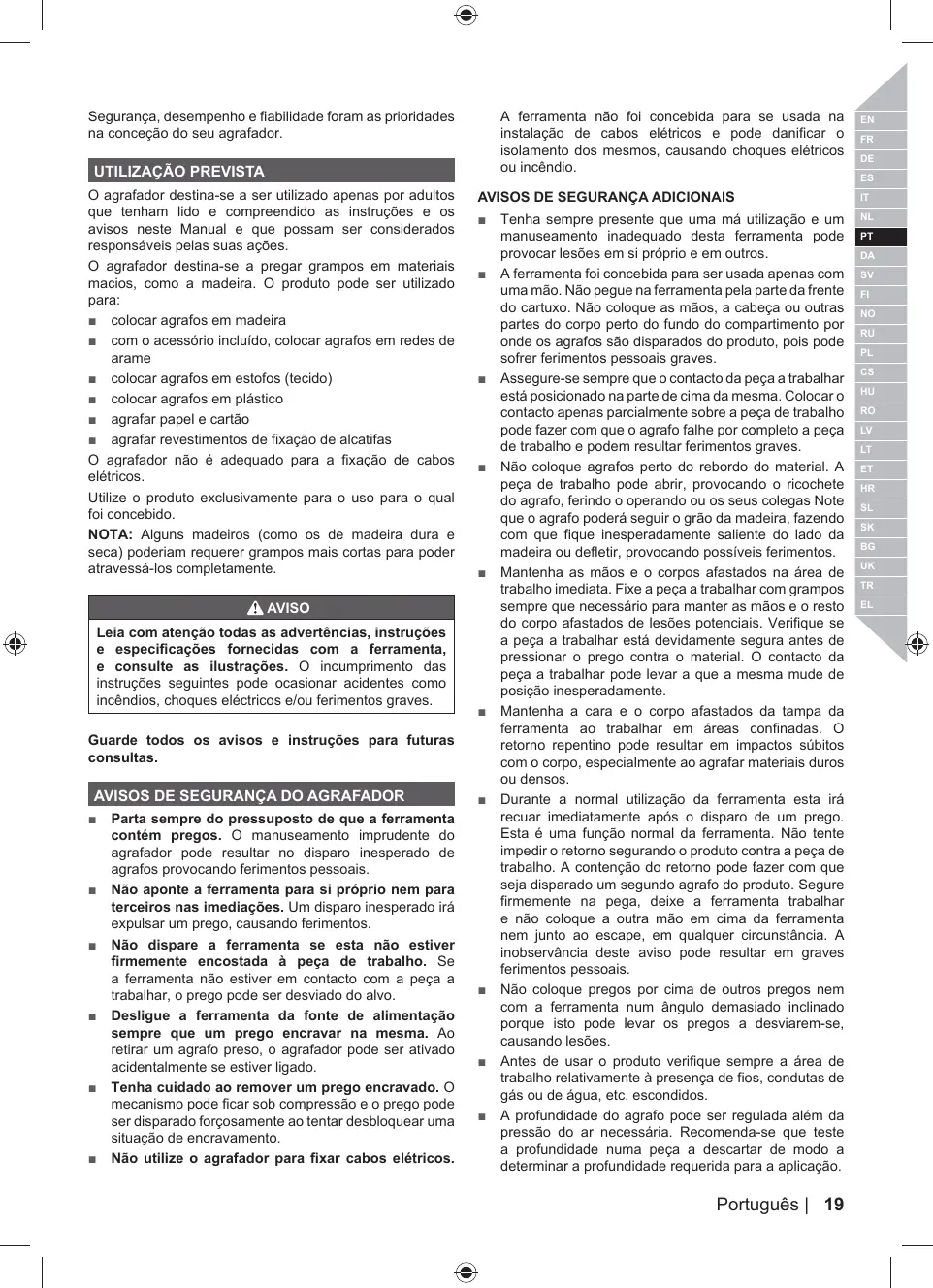 = Cet outil est conçu pour être utilisé d'une seule main. Ne maintenez pas l'outil par la partie avant du magasin. Ne mettez pas les mains, la tête ou une autre partie du corps à proximité du bas du compartiment où l'agrafe sort, car cela peut provoquer de graves blessures. = Assurez-vous toujours du bon contact avec la pièce à agrafer. Un contact partiel avec les pièces à agrafer peut entraîner le fait que l'agrafeuse passe totalement à côté de la pièce à fixer et provoque de graves blessures. N'introduisez pas d'agrafes sur le bord des matériaux. La pièce à agrafer peut se fendre et faire ricocher l'agrafe, ce qui peut vous blesser ou blesser un collègue. Sachez que la fixation peut suivre les aspérités du bois, ce qui peut provoquer une protubérance inattendue sur le côté de la pièce à agrafer, voire une déviation, et ainsi des blessures potentielles. = Gardez vos mains et votre corps éloignés du voisinage immédiat de la zone de travail. Maintenez la pièce avec des serre-joints lorsque cela est nécessaire afin de protéger vos mains et votre corps de tout danger potentiel. Assurez-vous du bon maintien de la pièce à fixer avant d'y apposer l'agrafeuse. Le contact avec la pièce à fixer peut entraîner son décalage de façon inattendue. = Gardez votre visage et votre corps éloignés de l'arrière de l'outil lorsque vous travaillez dans des endroits exigus. Un recul soudain peut provoquer un choc corporel, surtout quand on agrafe des matériaux denses ou durs. = En cours d'utilisation normale, l'outil subit un recul immédiatement après l'enfoncement d'une agrafe. Ceci est un fonctionnement normal de l'outil. Ne tentez pas d'éviter le recul en maintenant l'agrafeuse contre la pièce à agrafer. En empêchant le recul, vous pourriez provoquer l'insertion d'une deuxième agrafe par le produit. Saisissez fermement la poignée, laissez l'outi faire le travail et ne placez à aucun moment votre deuxième main sur le dessus de l'outil ou à proximité de la zone de sortie. Le non-respect de cet avertissement pourrait entraîner de graves blessures. N'agrafez pas par dessus d'autres agrafes ou en donnant trop d'angle à l'outil, ce qui risquerait de provoquer la déviation des agrafes et de possibles blessures. Vérifiez toujours l'éventuelle présence de câbles cachés, tuyaux de gaz ou d'eau, etc. avant d'utiliser le