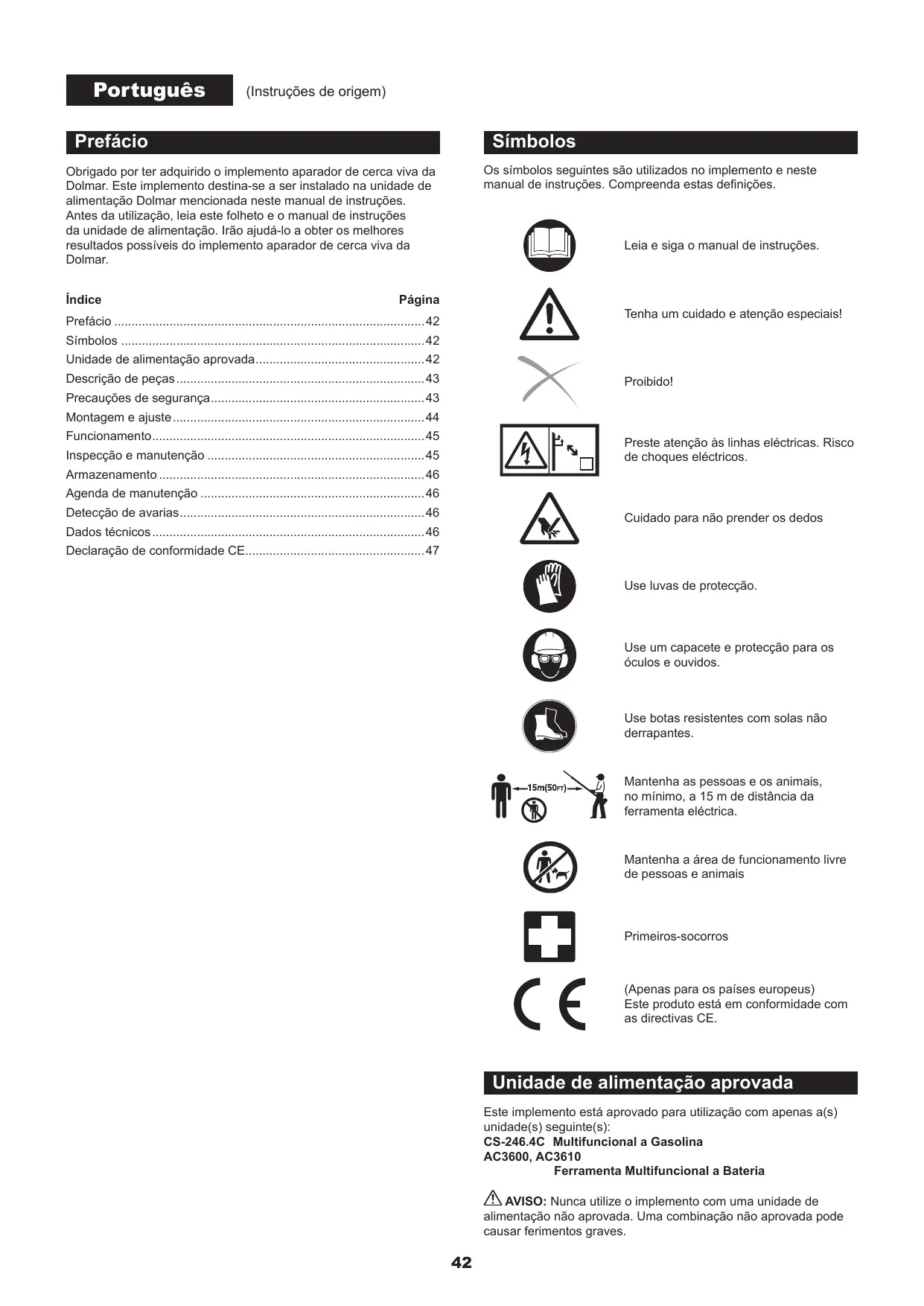 Utilize sempre peças sobresselentes e acessôrios originais da Dolmar. Utilizar peças ou acessérios fornecidos por terceiros pode resultar na avaria do equipamento, danos materiais e/ou ferimentos graves.