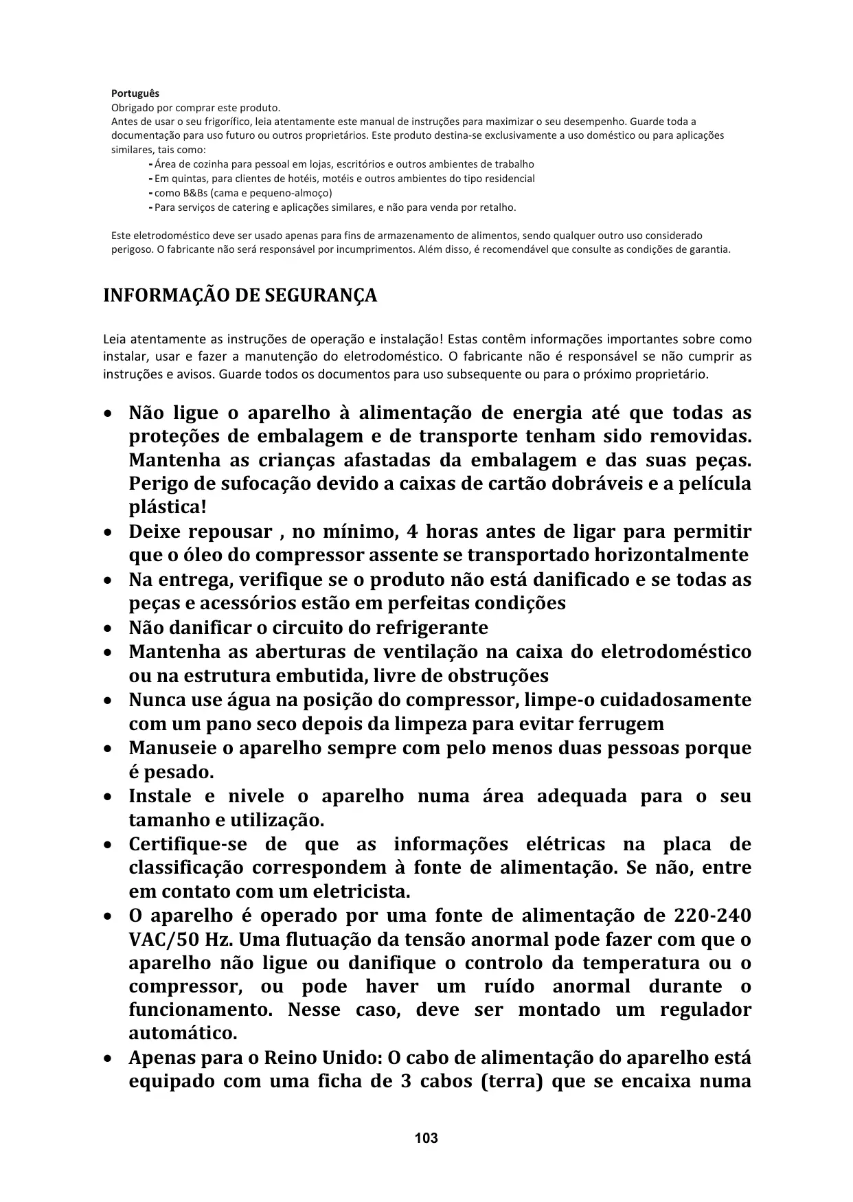 Cet appareil doit être utilisé uniquement pour conserver de la nourriture ; tout autre usage est considéré comme dangereux et le fabricant ne sera pas tenu responsable en cas de mauvaise utilisation. Il est donc recommandé de prendre connaissance des conditions de garantie.