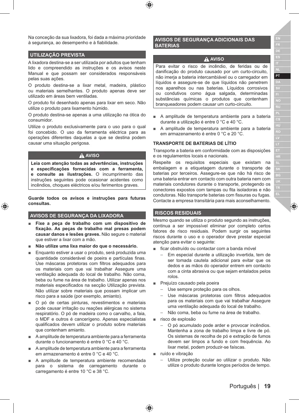Näo utilize uma lixa maior do que o necessärio. Enquanto estiver a usar o produto, ser produzida uma quantidade considerävel de poeira e particulas finas. Üse méscaras protetoras com filtros adequados para oS materiais com que vai trabalhar Assegure uma ventilaçäo adequada do local de trabalho. Näo coma, beba ou fume na ârea de trabalho. Utiizar apenas nos materiais especificados na secçäo Utilizaçäo prevista. Näo utilizar sobre materiais que possam implicar um risco para a saüde (por exemplo, amianto).