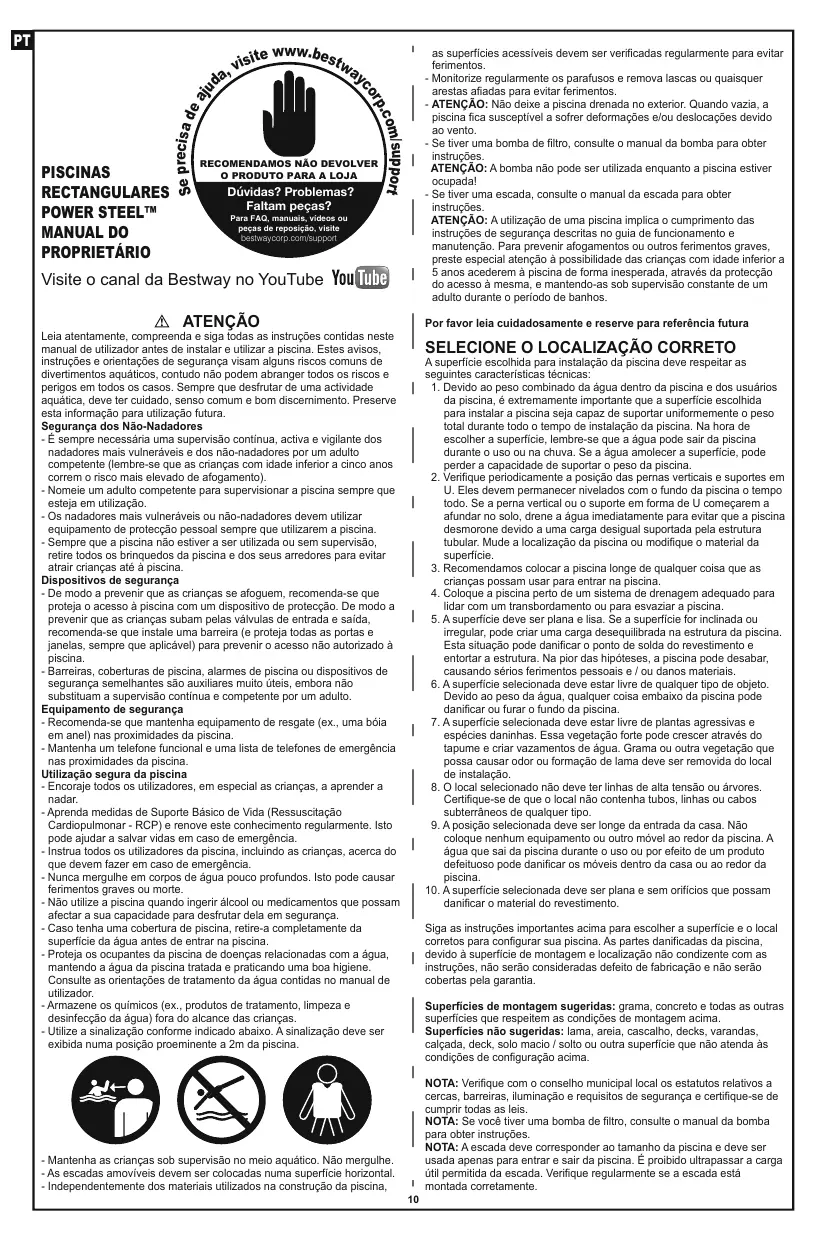 Baixe as instruções para o seu Piscine hors-sol em formato PDF gratuitamente! Encontre o seu manual POWERSTEEL - BESTWAY e retome o controlo do seu dispositivo eletrónico. Nesta página estão publicados todos os documentos necessários para a utilização do seu dispositivo. POWERSTEEL da marca BESTWAY.