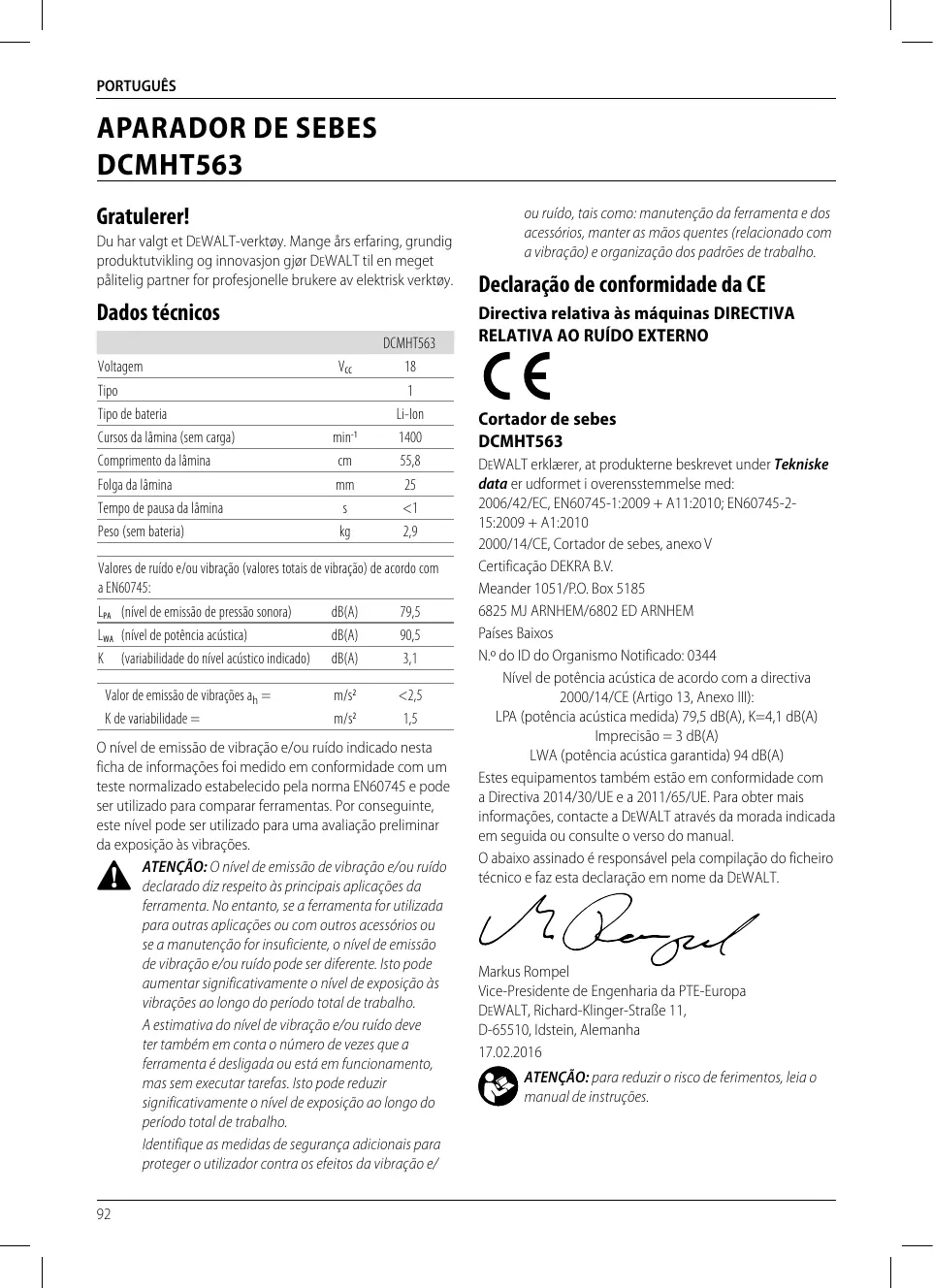 DCMHT563 Le soussigné est responsable de la compilation du fichier technique et fait cette déclaration au nom de DEWALT.