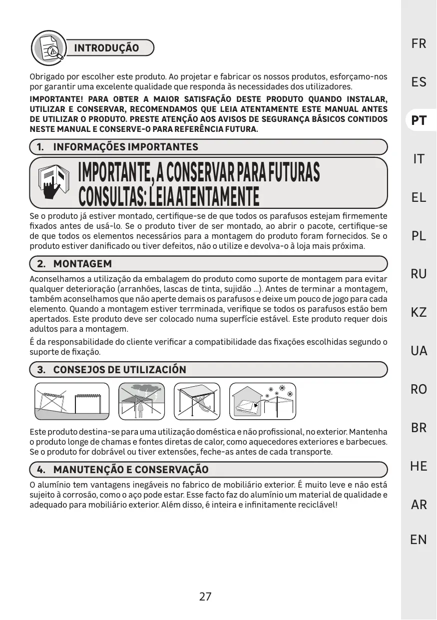 Este produto destina-se ao uso doméstico e näo comercial, ao ar Livre. Mantenha este produto longe de chamas ou fontes diretas de calor, como aquecedores externos e churrasqueiras. Se o produto for dobrävel ou tiver extensôes, feche-as antes de cada transporte.