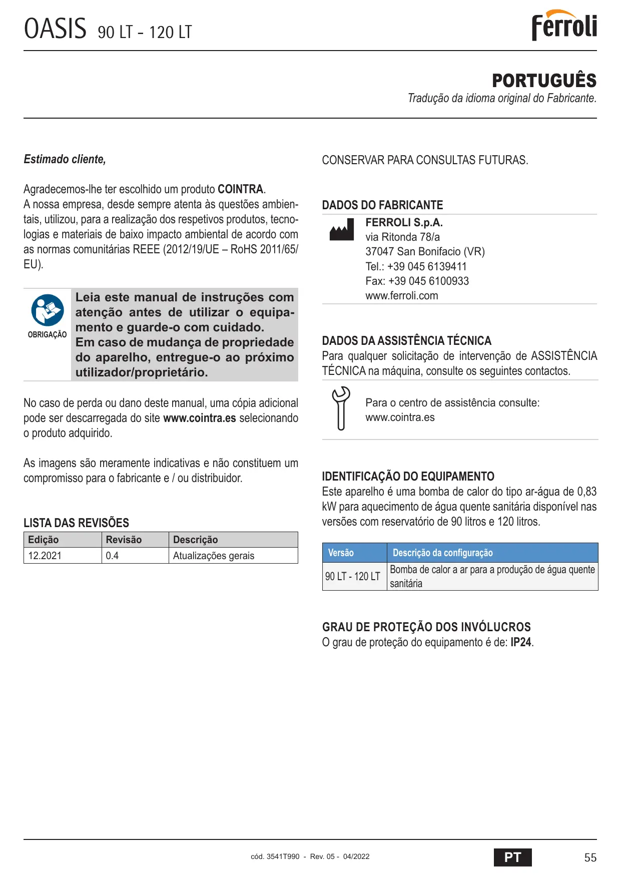 Encontre gratuitamente o manual do aparelho OASIS TECH COINTRA em formato PDF.