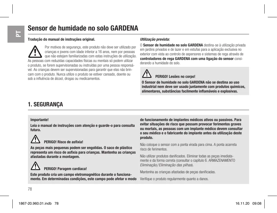 Baixe as instruções para o seu Capteur d'humidité em formato PDF gratuitamente! Encontre o seu manual 1867 - GARDENA e retome o controlo do seu dispositivo eletrónico. Nesta página estão publicados todos os documentos necessários para a utilização do seu dispositivo. 1867 da marca GARDENA.