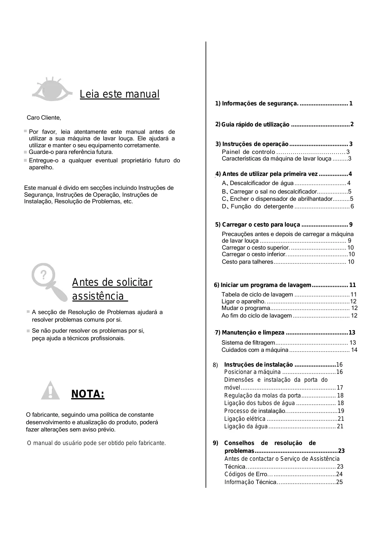 Por favor, leia atentamente este manual antes de utilizar a sua mäquina de lavar louça. Ele ajudarä a utilizar e manter o seu equipamento corretamente. Guarde-o para referência futura.