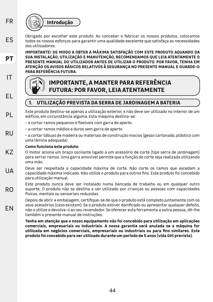 Si vous donnez cet outil à une autre personne, remettez-lui également ce manuel d'utilisation. Notez que notre matériel n'est pas destiné à des usages commerciaux ou industriels. La garantie devient caduque si la machine est utilisée pour des activités commerciales ou industrielles, ou à des fins équivalentes. Ce produit est conçu pour être utilisé pendant une période de 5 ans (durée de vie estimée).