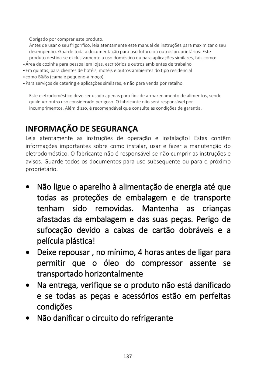 Cet appareil doit être utilisé uniquement pour conserver de la nourriture ; tout autre usage est considéré comme dangereux et le fabricant ne sera pas tenu responsable en cas de mauvaise utilisation. Il est donc recommandé de prendre connaissance des conditions de garantie