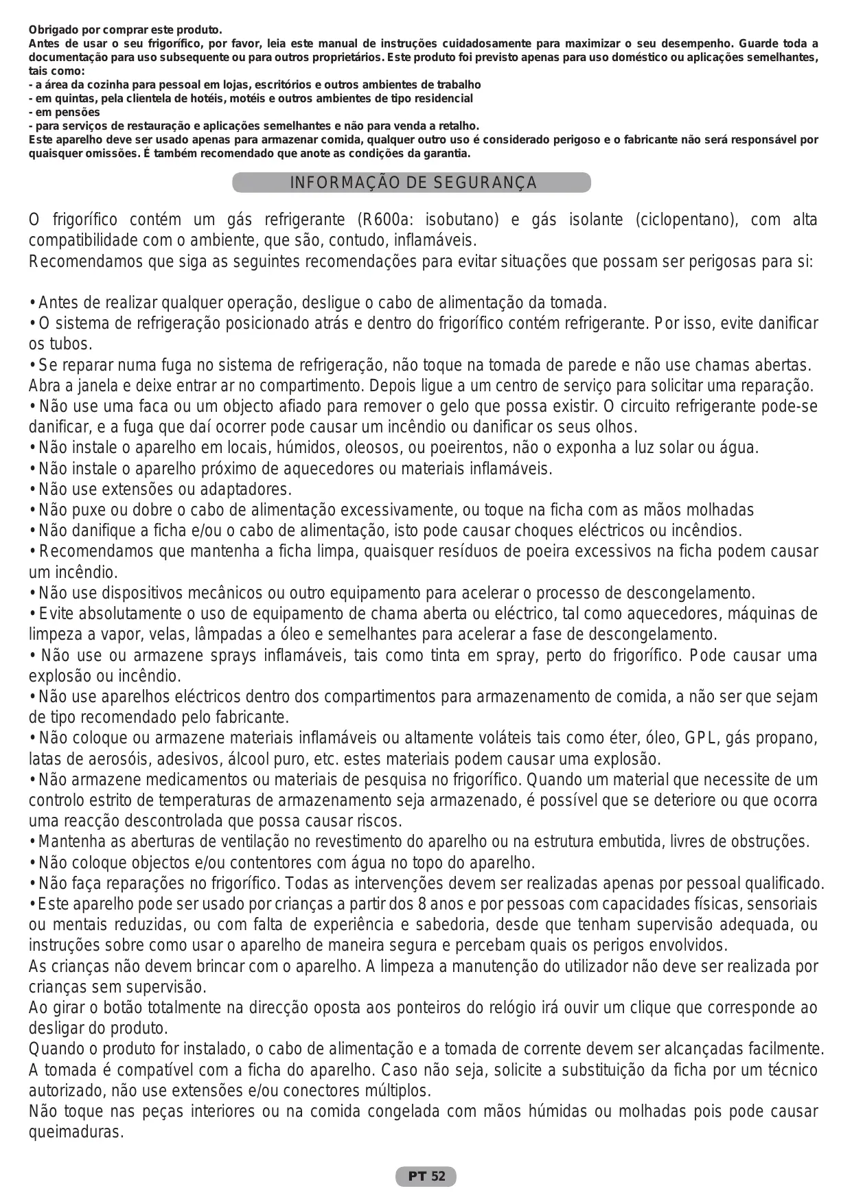 INFORMATIONS SUR LA SECURITE Le réfrigérateur contient un gaz réfrigérant (R660a : isobutane) et un gaz isolant (cyclopentane), dotés d'une compatibilité