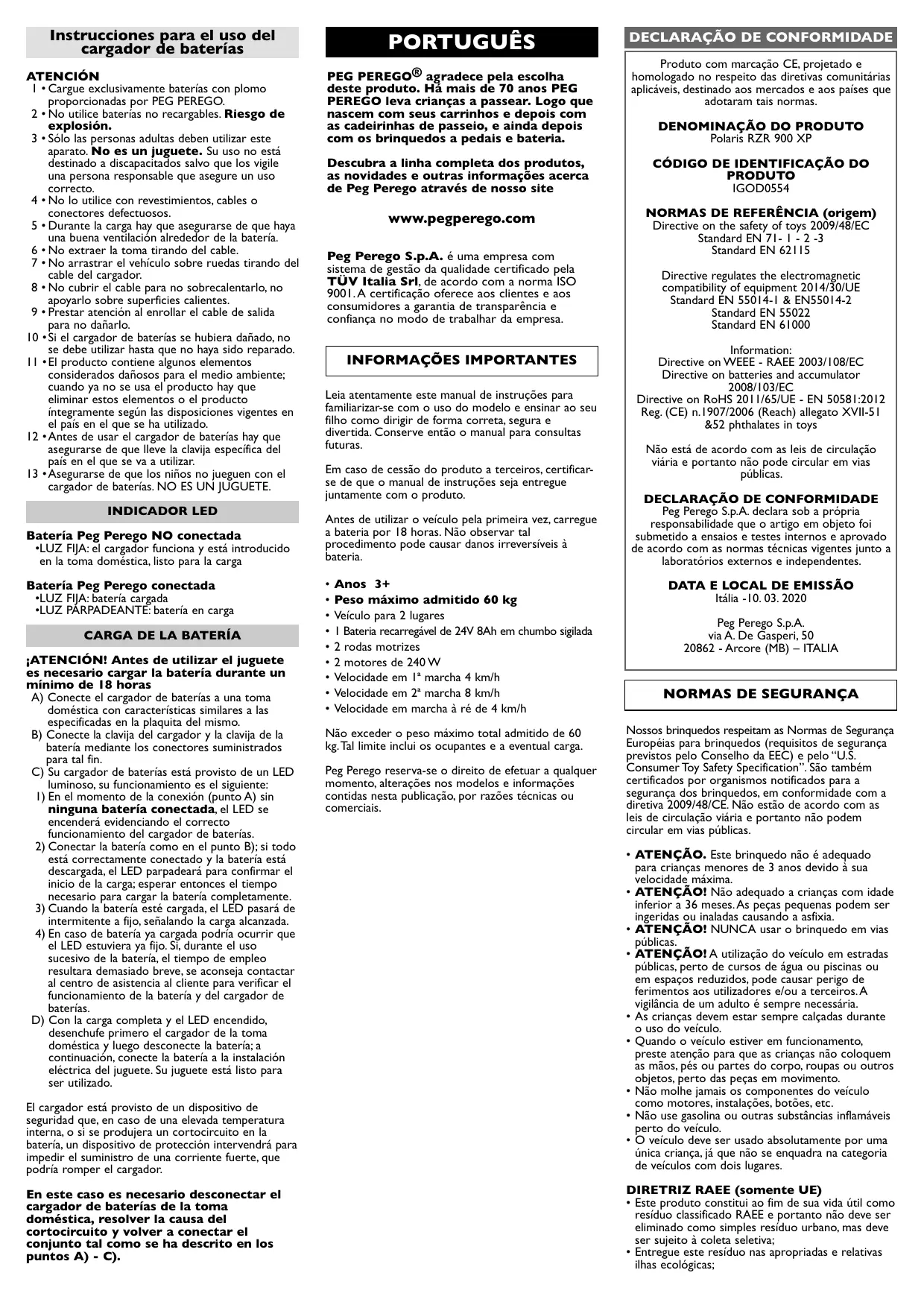 Baixe as instruções para o seu TOUT TERRAIN em formato PDF gratuitamente! Encontre o seu manual Polaris RZR 900 XP - PEG PEREGO e retome o controlo do seu dispositivo eletrónico. Nesta página estão publicados todos os documentos necessários para a utilização do seu dispositivo. Polaris RZR 900 XP da marca PEG PEREGO.