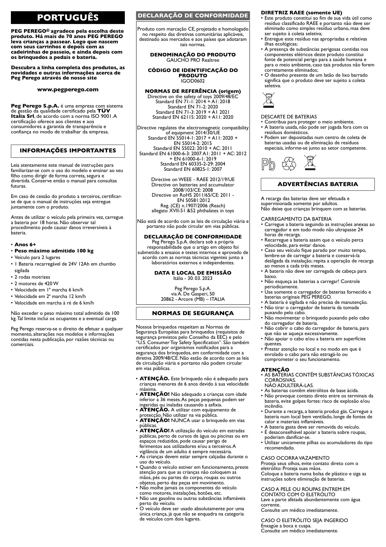 Encontre gratuitamente o manual do aparelho GAUCHO PRO Realtree PEG PEREGO em formato PDF.