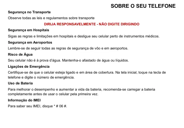 Ligaçôes de Emergéncia Gerifique-se de que o celular esta igado € em ârea de cobertur. Na telaiiciltoque na ecia de telefone & digite o nümera de emergéncia. Uso de Batoria