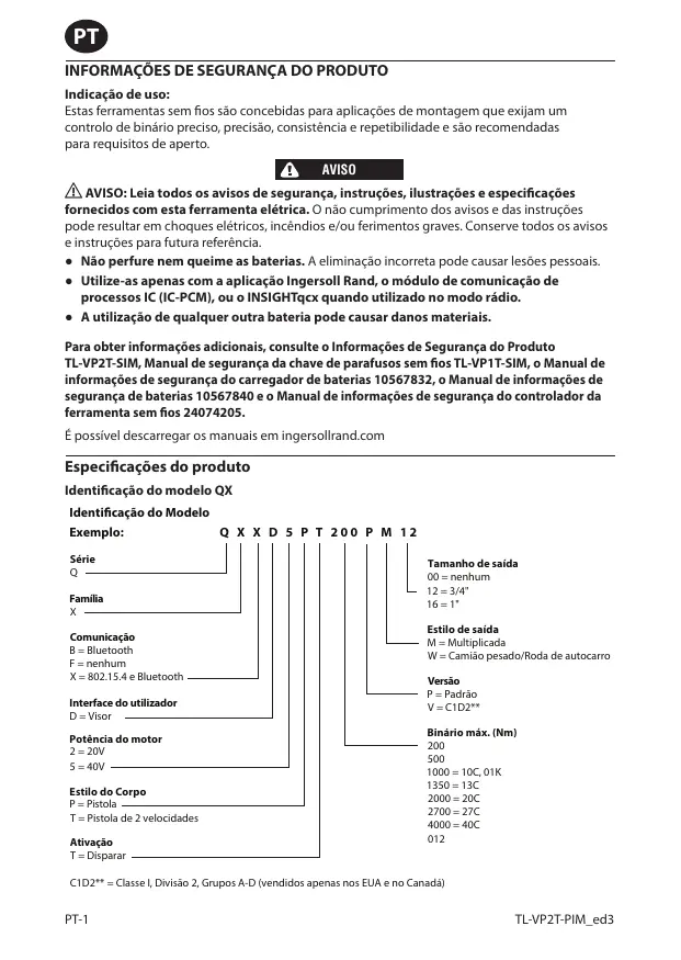 MANUAL DE UTILIZADOR TL-VP2T-PIM Ingersoll Rand