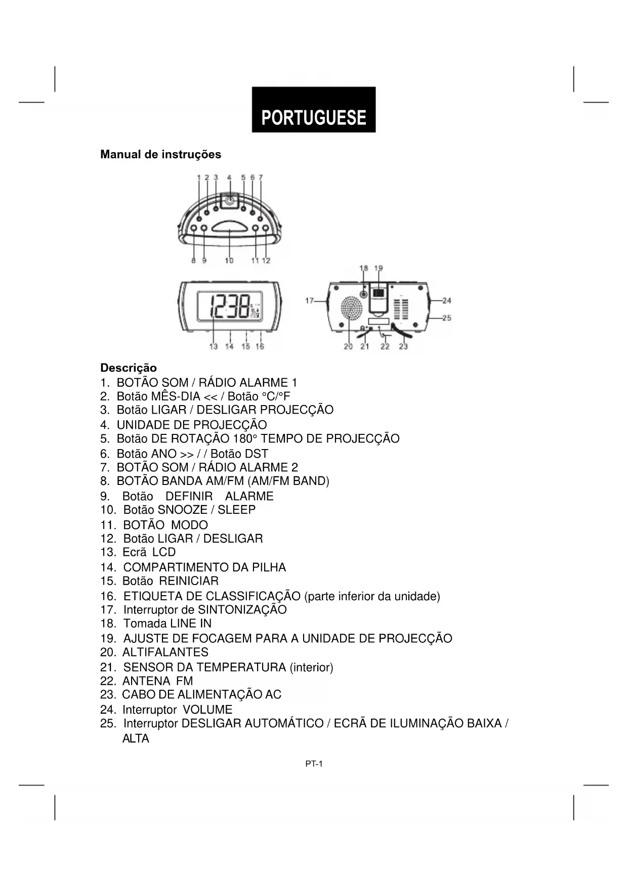 ALTA PT-1 PORTUGUESELigação da alimentação Insira a fi cha do CABO DE ALIMENTAÇÃO AC (23) numa tomada AC do electrodoméstico. A unidade está equipada com um sistema de pilha de reserva e necessita de uma pilha de lítio (normal) de 3V CR2032 (não incluída). Insira a pilha no COMPARTIMENTO DA PILHA (14), certifi cando-se de que os pólos da pilha positivo e negativo (+ e -) estão ligados aos pólos correspondentes indicados na placa do compartimento da pilha. Se ocorrer uma falha de alimentação AC, o relógio muda automaticamente para a fonte de alimentação e o relógio e o temporizador continuam a funcionar. Quando a alimentação AC for reposta, o relógio muda de novo para AC. Definições da hora, do calendário e do alarme A. Definição da hora e do calendário Pressione o botão MODO (11) no modo normal e mantenha-o pressionado durante 2 segundos para entrar no modo de defi nição da hora e depois de entrar no modo de defi nição, pressione o botão MODO (11) para alterar o ciclo do modo como o seguinte: Modo normal → Ano → Mês → Dia →12/24 H →RTC Hora → RTC Minuto → Modo normal Acção (durante o ajuste dos dados): - Pressione o botão << / MÊS-DIA / Botão °C/°F (2) para ajustar os dados para uma data anterior. - Pressione o botão ANO >> / botão DST (6) para ajustar os dados para uma data posterior. - Mantenha pressionado o botão MÊS-DIA << / Botão °C/°F ou >> / o botão ANO >> / botão DST (6) durante 2 segundos para activar avançar/retroceder automático. B. Definição do alarme 1 e do alarme 2 Pressione o botão DEFINIR ALARME (9) no modo normal e mantenha-o pressionado durante 2 segundos para entrar no modo de defi nição do alarme e depois de entrar no modo de defi nição, pressione o botão DEFINIR ALARME (9) para alterar o ciclo do modo como o seguinte: Modo normal → AL.1 Hora → AL.1 Minuto → AL.1 Alarme dia da semana → AL.2 Hora → AL.2 Minuto → AL.2 Alarme dia da semana → Modo normal PT-2PT-3 Seleccione o modo de alarme do dia da semana como o seguinte: 1-5 Segunda-feira a sexta-feira 1-7 Toda a semana 6-7 Sábado e domingo 1-1 Um dia da semana Acção (durante o ajuste dos dados): - Pressione o botão << / MÊS-DIA / Botão °C/°F (2) para ajustar os dados para uma data anterior. - Pressione o botão ANO >> / botão DST (6) para ajustar os dados para uma data posterior. - Mantenha pressionado o botão MÊS-DIA << / Botão °C/°F ou >> / o botão ANO >> / botão DST (6) durante 2 segundos para activar avançar/retroceder automático. Definição da saída do alarme e ligar / desligar o alarme - Pressione o botão ALARME 1 RÁDIO / SOM (1) / botão ALARME 2 RÁDIO / SOM (7) para música para seleccionar despertar com rádio, defi nir para som para seleccionar despertar com som e defi nir o alarme para a posição desligar para desactivar o alarme. - Defi na o Interruptor DESLIGAR AUTOMÁTICO / ECRÃ DE ILUMINAÇÃO BAIXA / ALTA (25) para a posição DESLIGAR AUTOMÀTICO (o ecrã desligará automaticamente em 15 segundos). Quando o alarme tocar,o ecrã ligará automaticamente de novo. Duração do alarme e função snooze A. Duração do alarme O alarme com som ou o alarme com rádio continuarão a tocar durante 30 minutos se nenhuma tecla for pressionada, depois parará automaticamente e aguardará pela hora do alarme no dia seguinte. B. Função snooze - Durante o alarme, ao pressionar o botão SNOOZE / SLEEP (10) activará a função snooze e o alarme com som ou o alarme com rádio pararão. - O intervalo de som é de 9 minutos - A função snooze continuará a não ser que o botão LIGAR/DESLIGAR (12) seja pressionado para terminar o alarme do rádio ou o alarme com som. O alarme parará automaticamente após 30 minutos. - Defi na o Interruptor DESLIGAR AUTOMÁTICO / ECRÃ DE ILUMINAÇÃO BAIXA / ALTA (25) para a posição DESLIGAR AUTOMÁTICO (o ecrã desligará automaticamente em 15 segundos). Quando o alarme tocar, o ecrã ligará automaticamente de novo. Pressione o botão SNOOZE / SLEEP (10) para activar a função snooze, parar o alarme e desligar o ecrã.Alterar o conteúdo do ecrã Pressione o botão MÊS-DIA << / botão °C/°F para apresentar no ecrã Mês/Dia, após 5 segundos decorridos o ecrã muda automaticamente para a hora. Pressione o botão ANO >> / botão DST para apresentar no ecrã Ano, após 5 segundos decorridos o ecrã muda automaticamente para a hora. Função Sleep Quando ligar o rádio, pressione o botão SNOOZE / SLEEP (10) para ligar o modo sleep. A hora de descanso continuará a piscar durante 5 segundos, durante essa hora pressione o botão SNOOZE / SLEEP (10) de novo para mudar a duração da hora de 90 para 15 minutos. Pressione o botão LIGAR /DESLIGAR (12) para cancelar a função sleep. Iluminação do ecrã Quando desligar o rádio, defi na o interruptor DESLIGAR AUTOMÁTICO / ECRÃ DE ILUMINAÇÃO BAIXA / ALTA (25) para a posição DESLIGAR AUTOMÁTICO e o ecrã LCD desligará automaticamente em 15 segundos. - Pressione qualquer tecla para ligar o ecrã. DST - Daylight Saving Time (horário de Verão e Inverno) Pressione o botão DST >> / (6) e mantenha-o pressionado durante 3 segundos para alternar entre os horários de Verão e Inverno. Funcionamento do rádio - Pressione o botão LIGAR /DESLIGAR (12) para ligar o rádio. - Defi na o botão DE BANDAS AM/FM (8) para a banda de rádio que deseja. - Seleccione a estação utilizando o interruptor de SINTONIZAÇÃO (17). - Rode o interruptor VOLUME (24) para ajustar o volume conforme deseja. - Pressione o botão LIGAR /DESLIGAR (12) de novo para desligar o rádio. Notas: - A banda AM utiliza uma antena direccional interna, movimente o rádio para uma melhor recepção. - Assegure-se que a antena FM (22) está completamente desenrolada e esticada para uma melhor recepção FM. Tomada LINE IN A tomada LINE IN (18) pode ser utilizada reproduzir fontes de sinal de áudio alternadas nos altifalantes da unidade. Esta tomada LINE 
