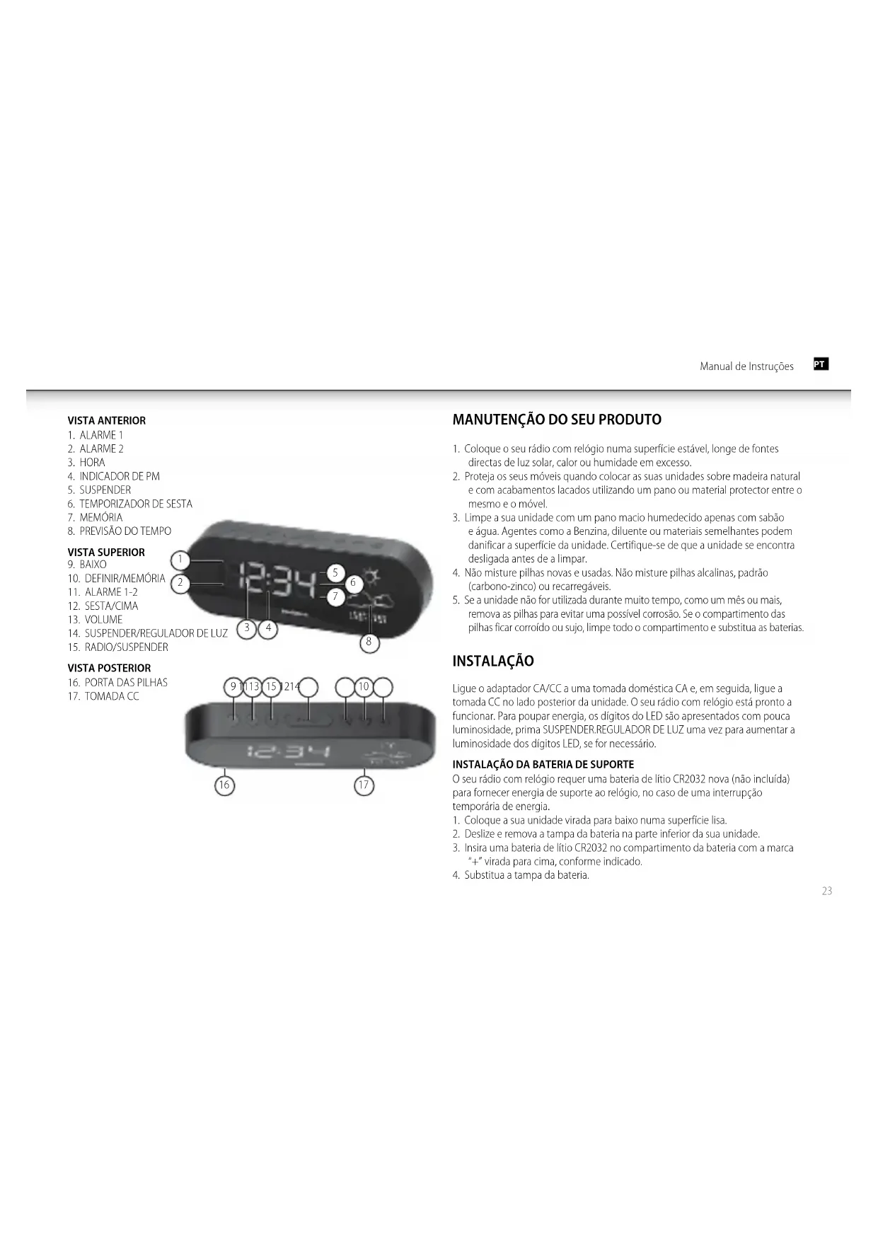 O seu rádio com relógio requer uma bateria de lítio CR2032 nova (não incluída) para fornecer energia de suporte ao relógio, no caso de uma interrupção temporária de energia.
