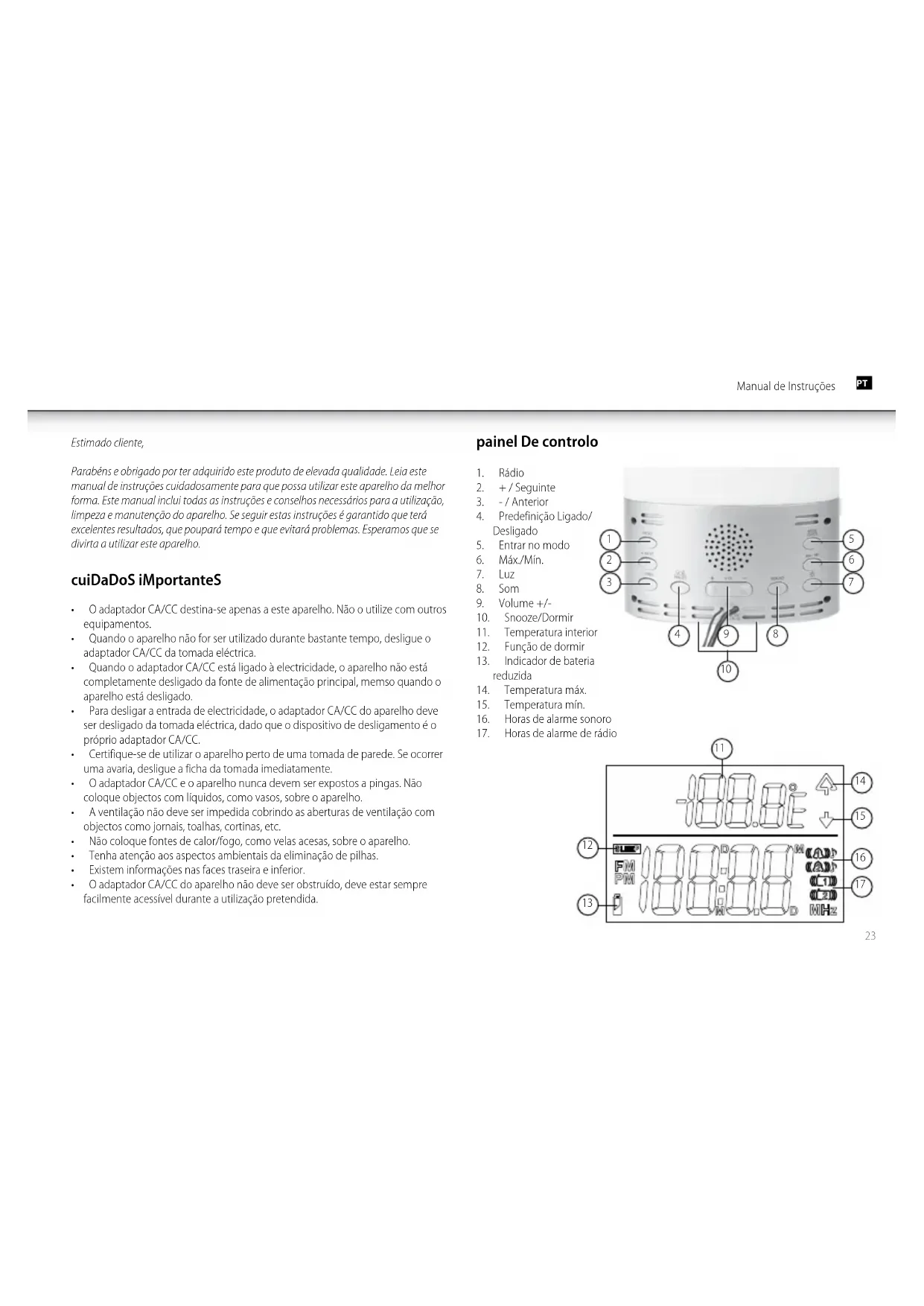 - Nota:quandoorádioestiverLIGADO,épossívelpremirobotãoLIGAR/ DESLIGARPREDEFINIÇÃOparapercorreroscanaispredefinidos,existemcinco canaisdisponíveis.Nomododerádio,primaobotãoENTRARNOMODOpara apresentarRelógio,Alarme1,Alarme2eCalendáriodurantecincosegundose sairáautomaticamente,apresentandoafrequênciaderádio.