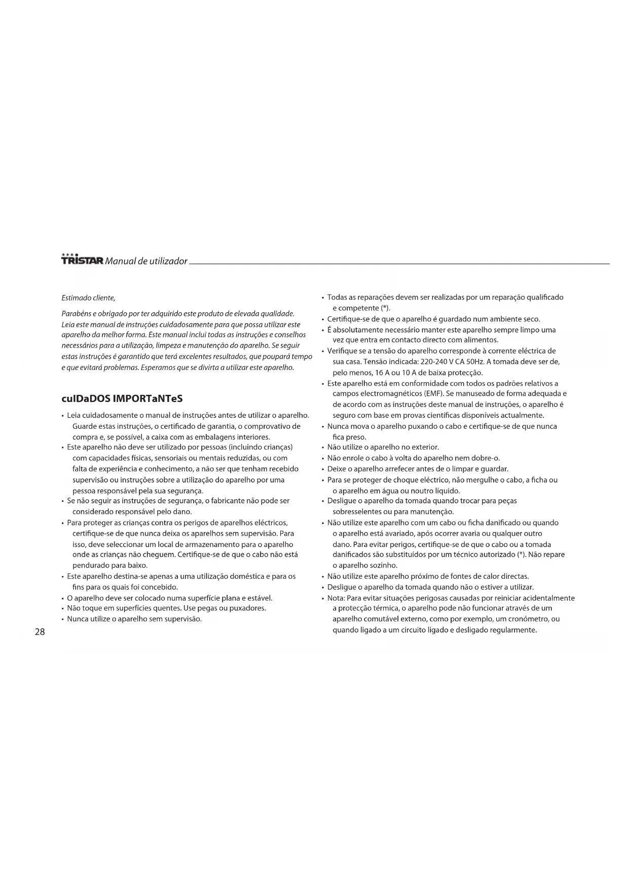 • A Tristar não será responsável por danos materiais ou ferimentos