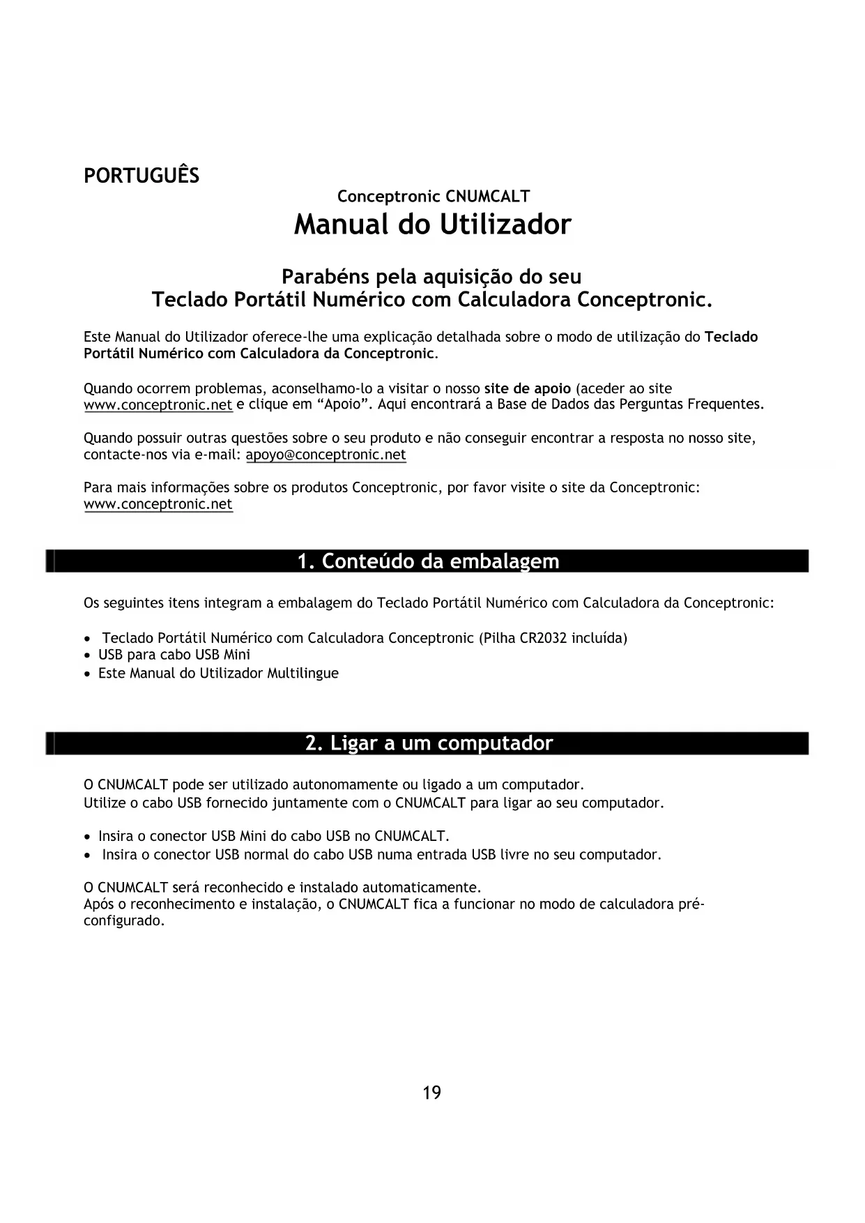 Conceptronic CNUMCALT Manual do Utilizador Parabéns pela aquisição do seu Teclado Portátil Numérico com Calculadora Conceptronic. Este Manual do Utilizador oferece-lhe uma explicação detalhada sobre o modo de utilização do Teclado Portátil Numérico com Calculadora da Conceptronic. Quando ocorrem problemas, aconselhamo-lo a visitar o nosso site de apoio (aceder ao site www.conceptronic.net e clique em “Apoio”. Aqui encontrará a Base de Dados das Perguntas Frequentes. Quando possuir outras questões sobre o seu produto e não conseguir encontrar a resposta no nosso site, contacte-nos via e-mail: apoyo@conceptronic.net Para mais informações sobre os produtos Conceptronic, por favor visite o site da Conceptronic: www.conceptronic.net