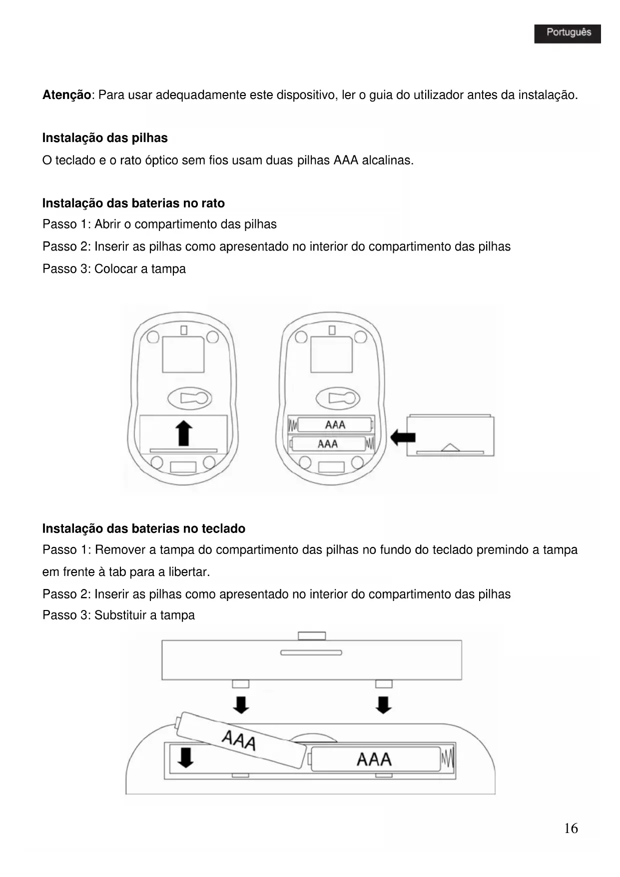 15Atenção: Para usar adequadamente este dispositivo, ler o guia do utilizador antes da instalação. pilhas AAA alcalinas. rato sso 1: Abrir o compartimento das pilhas Passo 2: Inserir as pilhas como apresentado no interior do compartimento das pilhas Passo 3: Colocar a tampa
