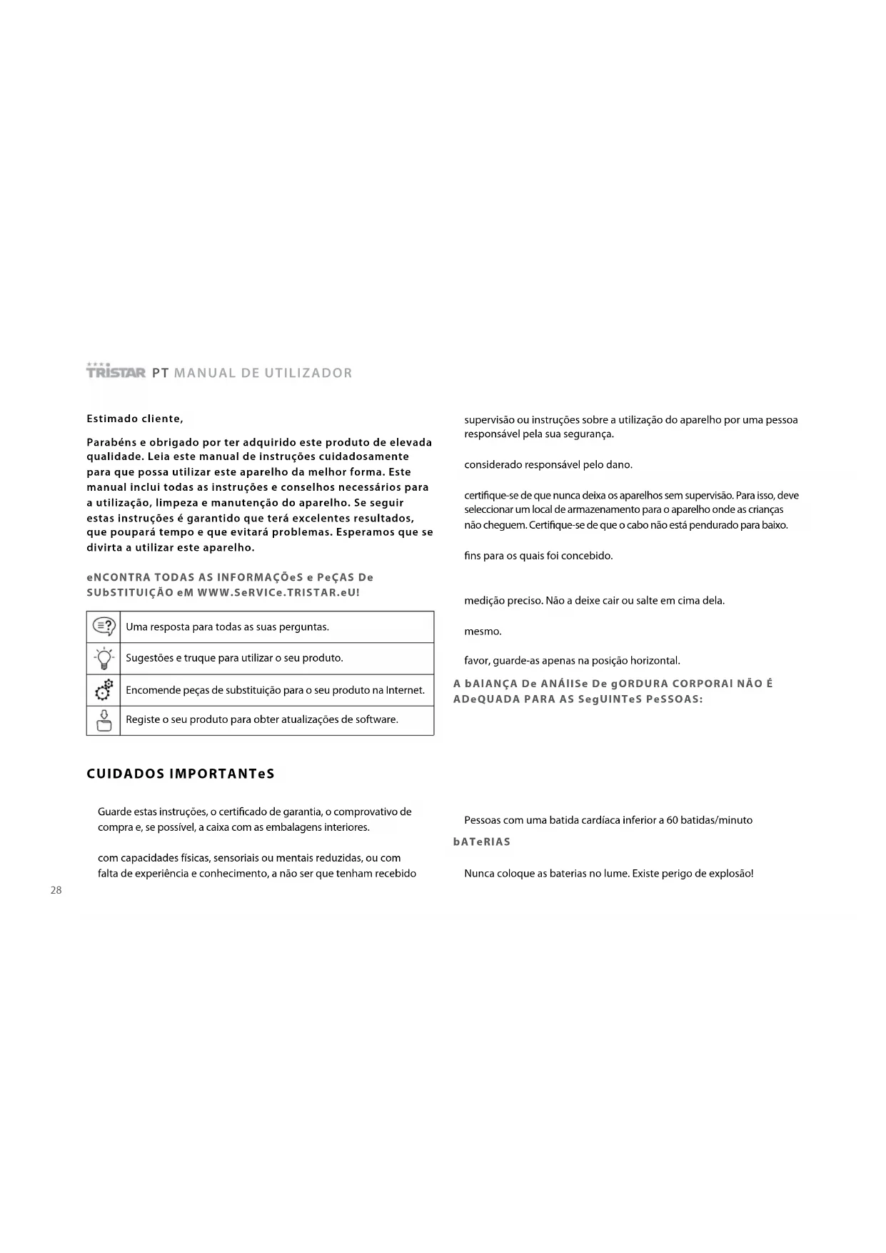 •A Tristar não será responsável por danos materiais ou ferimentos