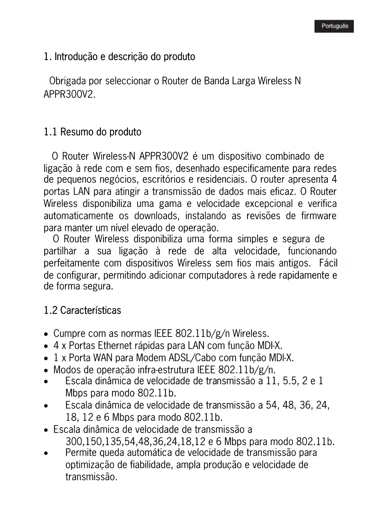 Cumpre com as normas IEEE 802.11b/g/n Wireless. 4 x Portas Ethernet rápidas para LAN com função MDI-X. 1 x Porta WAN para Modem ADSL/Cabo com função MDI-X. Modos de operação infra-estrutura IEEE 802.11b/g/n. Escala dinâmica de velocidade de transmissão a 11, 5.5, 2 e 1 Mbps para modo 802.11b. Escala dinâmica de velocidade de transmissão a 54, 48, 36, 24, 18, 12 e 6 Mbps para modo 802.11b. Escala dinâmica de velocidade de transmissão a 300,150,135,54,48,36,24,18,12 e 6 Mbps para modo 802.11b. Permite queda automática de velocidade de transmissão para optimização de fiabilidade, ampla produção e velocidade de transmissão. Suporta encriptação de dados Wireless com a norma 64/128-bit WEP para segurança. Suporta segurança activa para WPA-PSK, WPA2-PSK, WPA e WPA2. Ferramentas de configuração baseadas em Web e gestão através de navegador WEB. Suporta protocolo PPPoE/PPTP/L2TP para ADSL. Suporta NAT para partilha de 1 endereço IP para todos os utilizadores LAN. Suporta DHCP servidor/Cliente. Suporta protecção firewall, mapeamento servidor virtual e ajustes aplicação especial. Suporta UPnP. Suporta informação estatística.